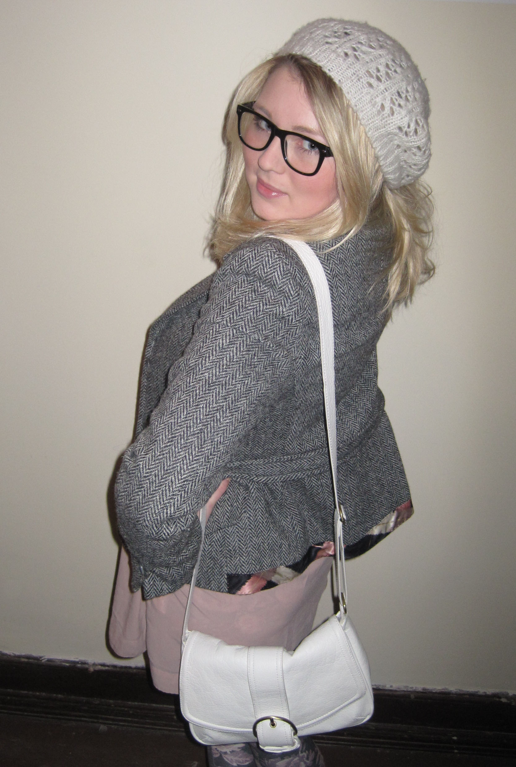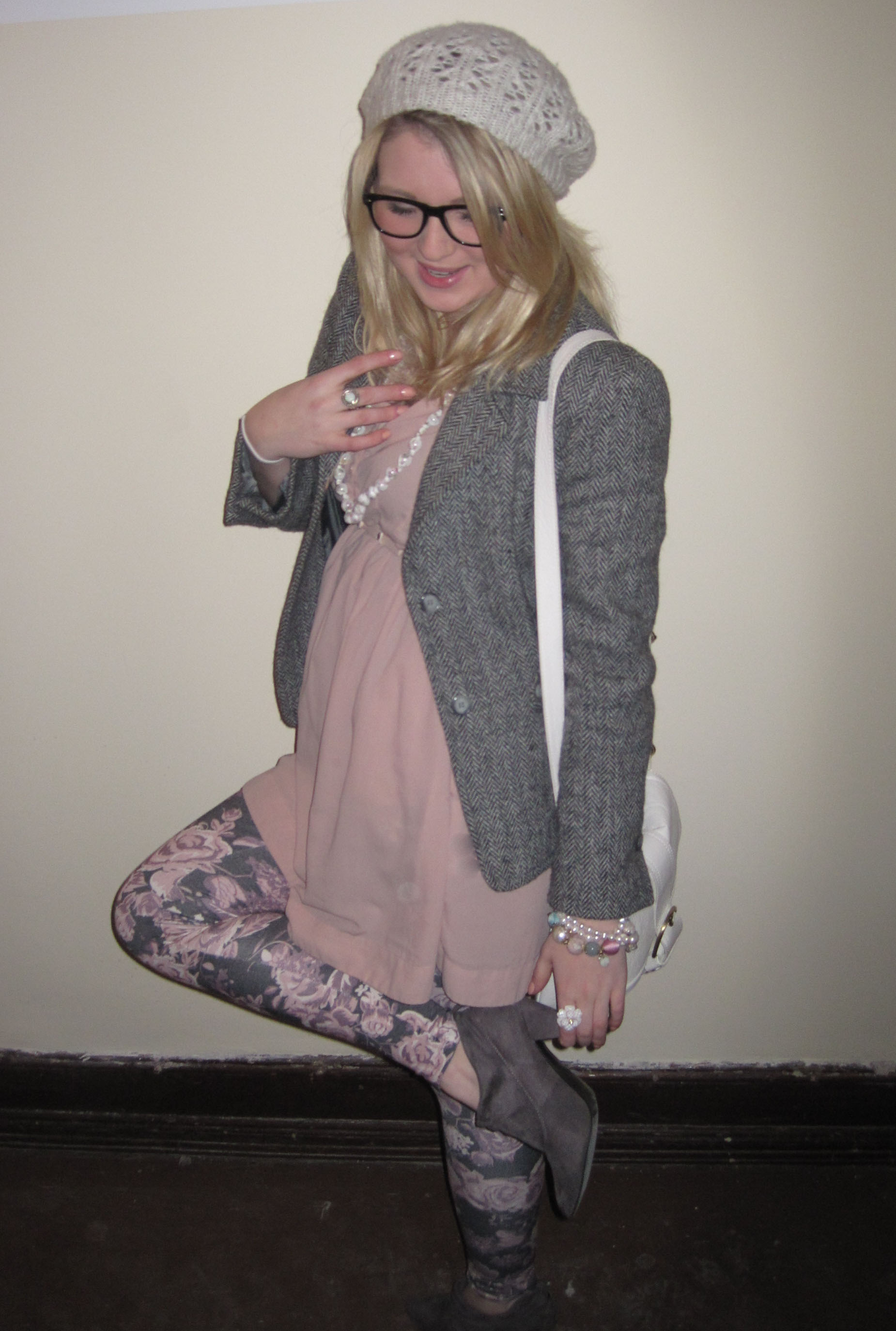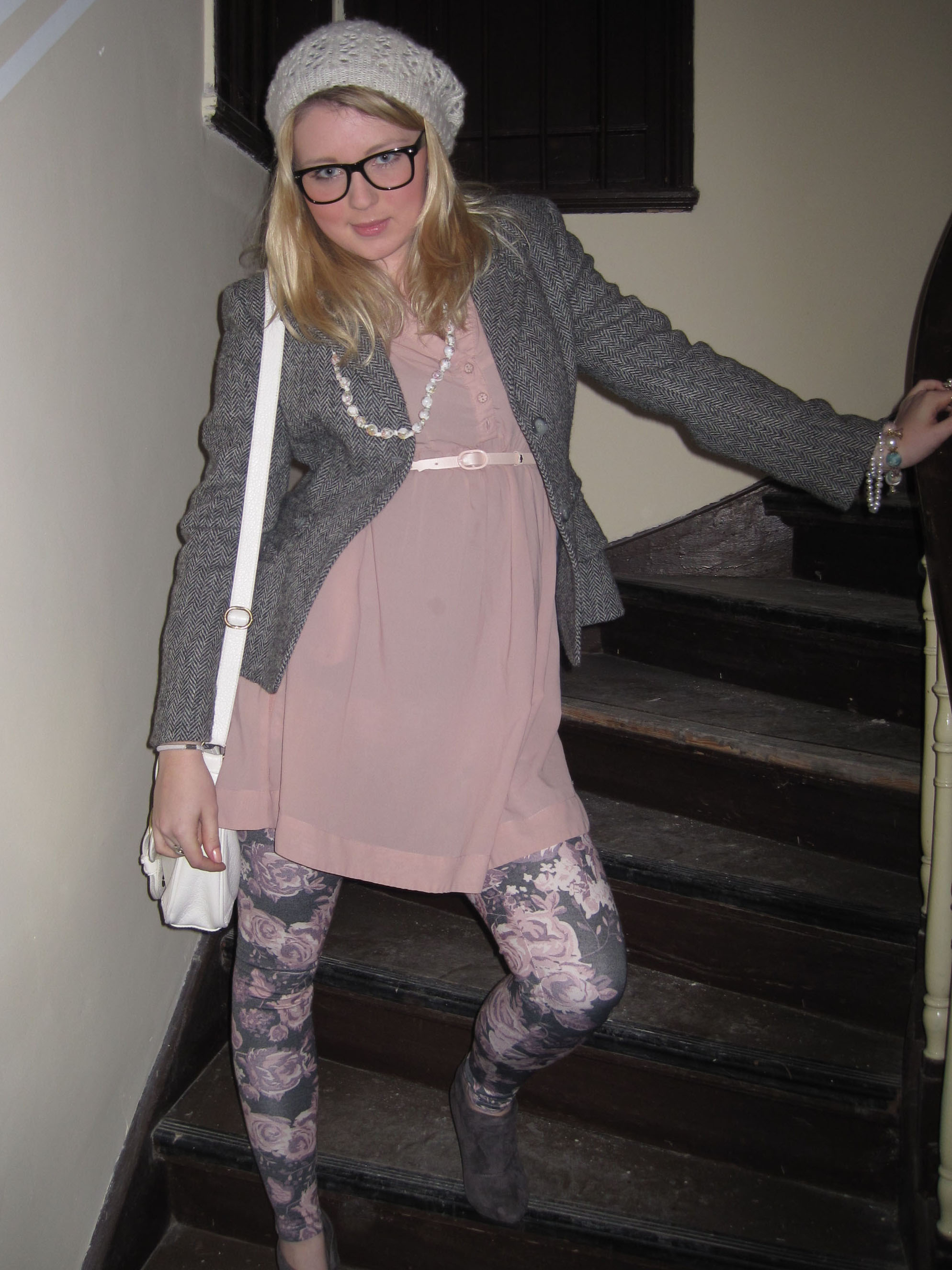 jacket: Najla Hamburg | leggins: H&M | booties: Pimkie | dress: Vero Moda | belt: H&M | glasses: London Market | necklace: Polish Market | bracelet: Accessorize | bag: H&M | knitted cap: New Look | flower Ring: Primark