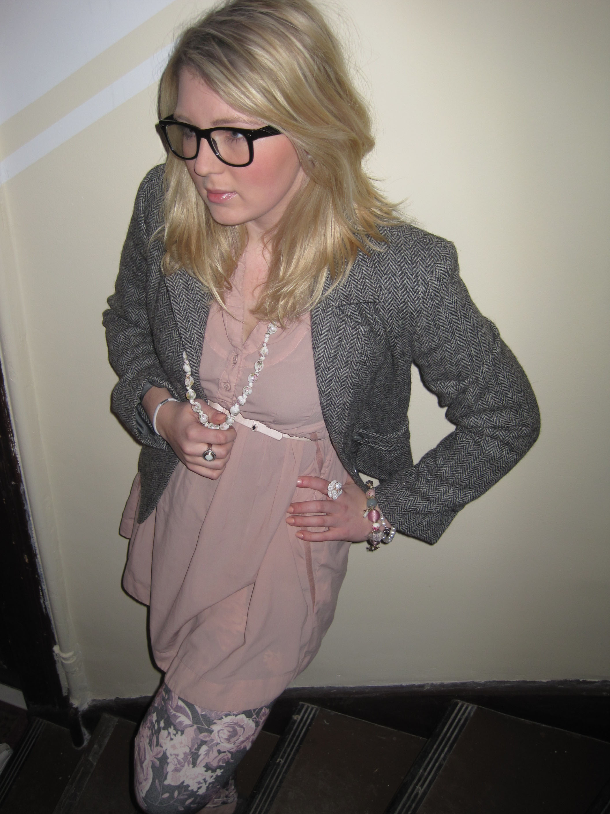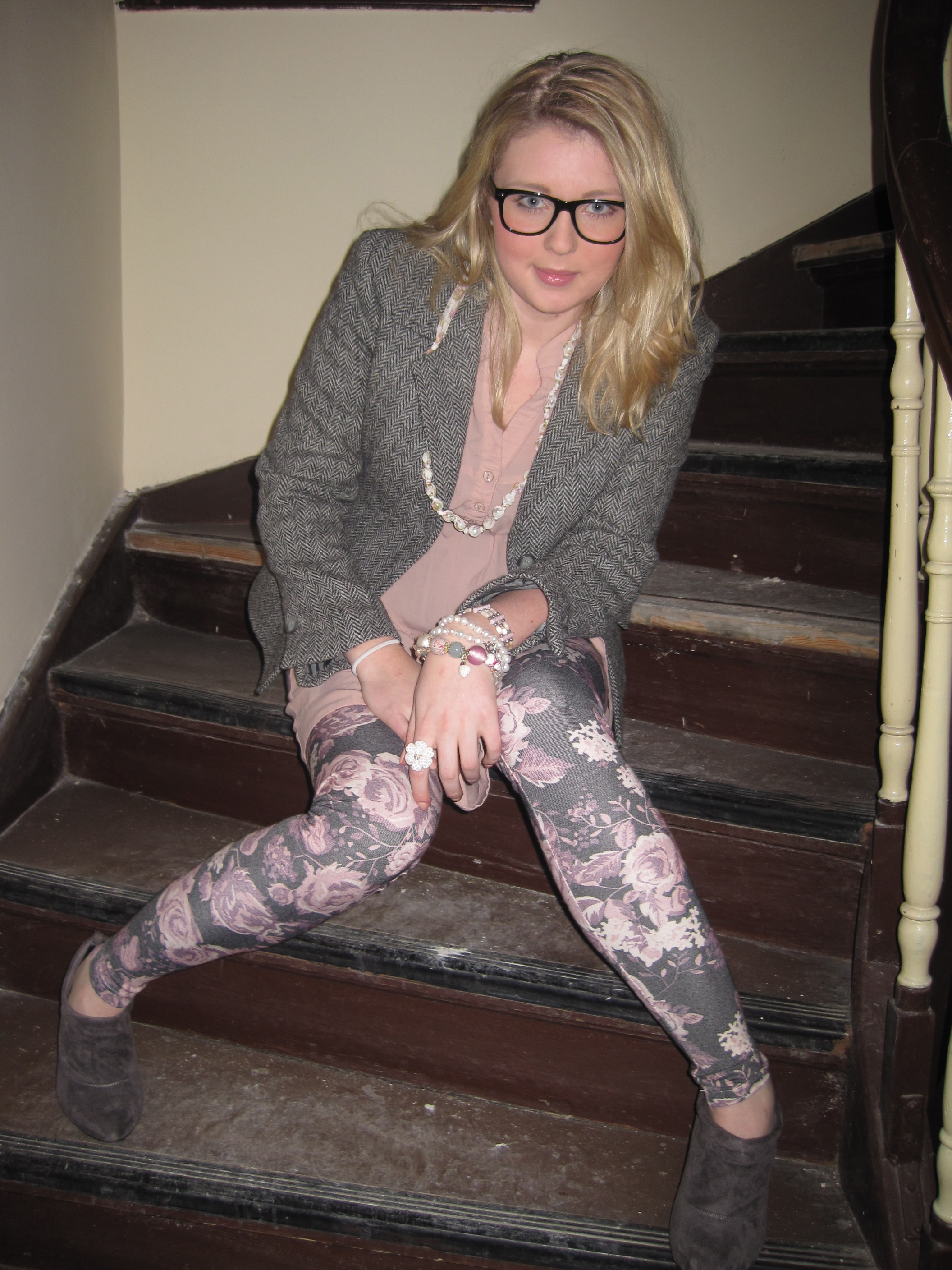EN: Today again a few pictures from my weekend-shoot. We shot at night on the staircase of a friend’s house. I borrowed the Booties and the blazer from her. I absolutely fell in love with the cute blazer. It fits perfect and has cute details. I bought the floral leggings not long ago – hoping, that spring will come soon.