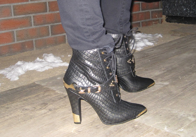 DE: Heute war der Geburtstag von meinem Freund. Wir haben den Tag ganz ruhig beim Sushi essen und mit dem austesten seines neue WII Fit Boards verbracht. Mein Outfit bestand hauptsächlich aus schwarz und gold. Die einzige Knall-Farbe waren meine roten Lippen. Das ist seit kurzen meine Lieblingslippen- und glossfarbe! Die Schuhe wurden heute eingeweiht. Ich habe sie letzte Woche von meinem Freund bekommen und das obwohl ich ihm gegenüber nie erwähnt habe, dass ich solche Schuhe gut finde. Ich habe mich wahnsinnig über sie gefreut, vor allem das ich vormittags am selben Tag noch in der Stadt ganz neidisch einem Mädchen mit schlichten, schwarzen Schnürschuhen hinterhergeguckt habe. Aber diese sind ja noch besser. Muss schon sagen, dass ich stolz bin, dass mein Freund so einen so tollen Geschmack hat!