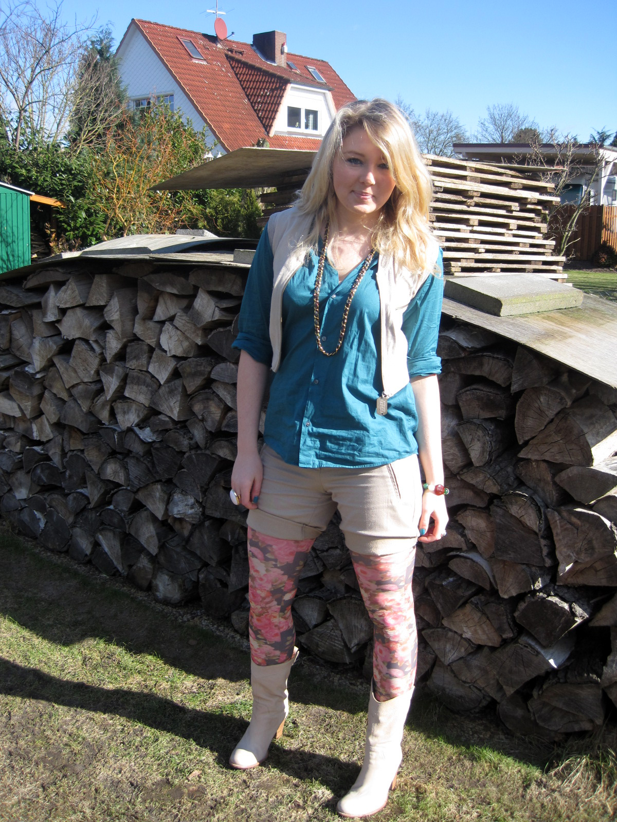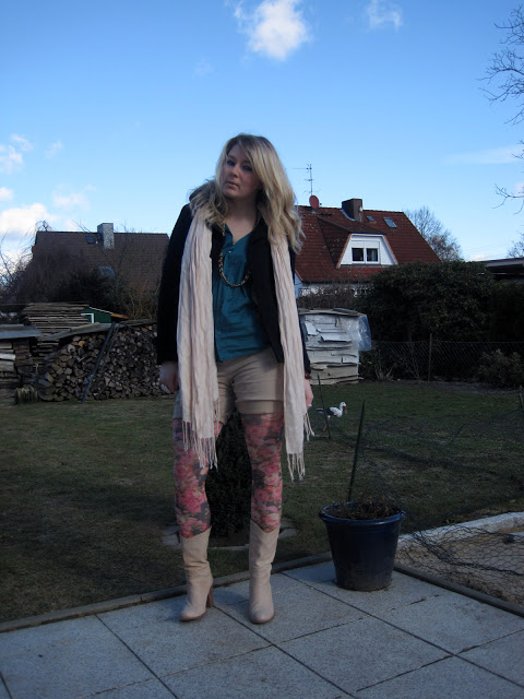 DE: Das Wetter ist einfach verrückt. Die Fotos sind am Freitag Mittag entstanden. Auf dem ersten Foto sieht man noch, dass keine Sonne schien und auf den zweiten strahlt sie dafür ordentlich. Es war herrlich endlich mal die Frühlingssonne zu sehen. Die geblümte Strumpfhose ist perfekt für so ein Frühlingswetter. Allerdings sah das ganze abends nach der Arbeit nicht mehr so aus. Als ich nämlich das Gebäude verließ stapfte ich in Neuschnee und zwar eine ganze Menge. Ich musste mein Auto erst mal von dem Schneehaufen befreien und dann schneite es auch noch so sehr, dass ich kaum die Straße sehen konnte. Schrecklich diese Temperaturschwankungen!