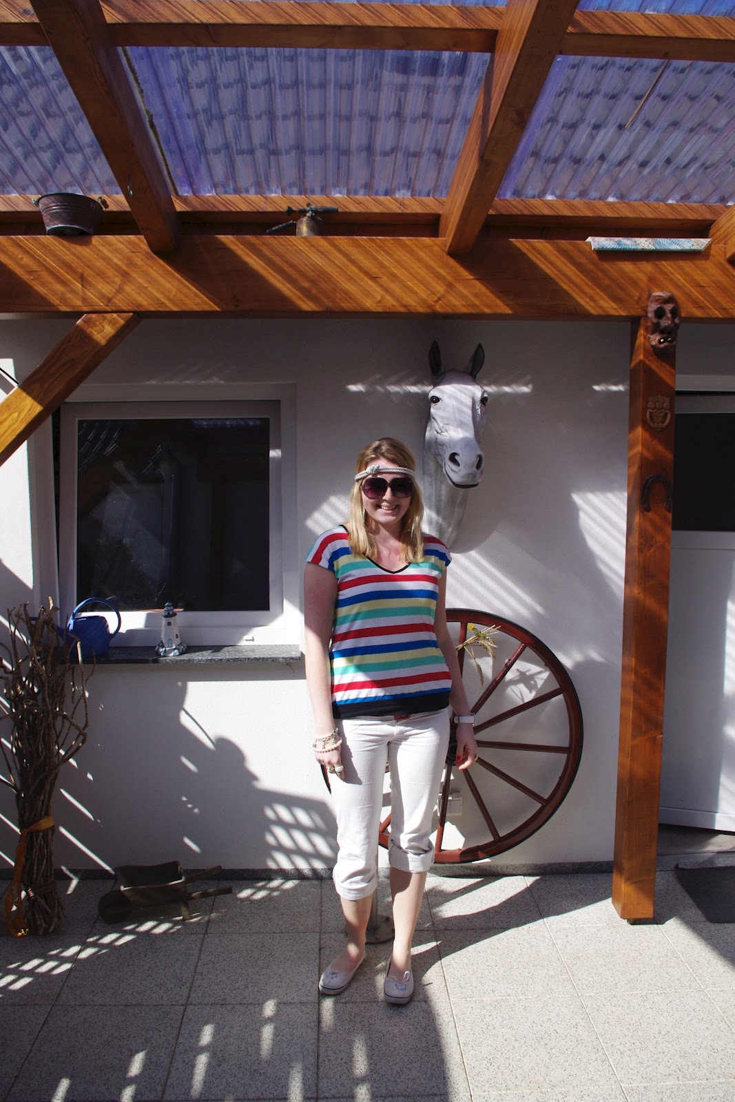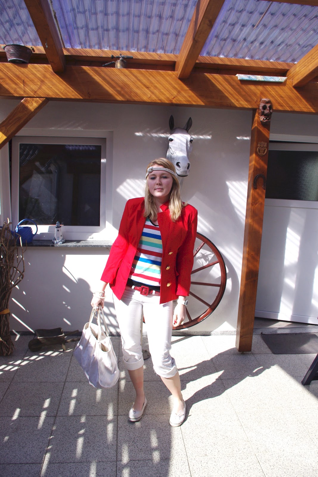 EN: The maritime look with more colors then usual. It must not always be the two-colored stripes and blue blazers. Sonia Rykiel is successful with colorful stripes for years now in fashion industry. As you can see the maritime look with more color works really good. I love the headband, which looks like a rope with a sailor knot. I even manged to smile while taking being photographed :D