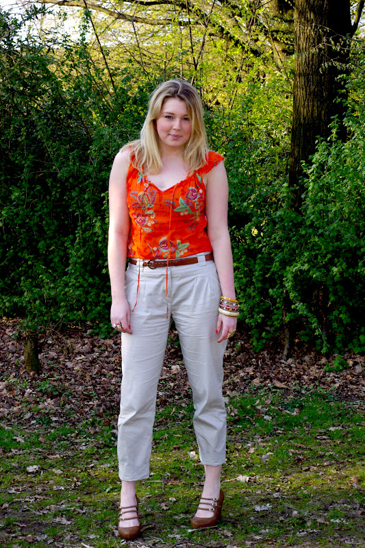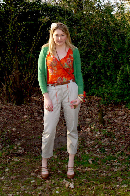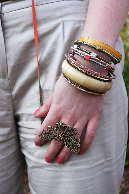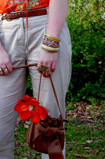 WOW!!! Tolle Hose (suche auch so eine!) und schönes Outfit! Ich liebe deine Accesoires! Wunderschön kombinierte Armreife und die Tasche mit der Blume ist super sweet!