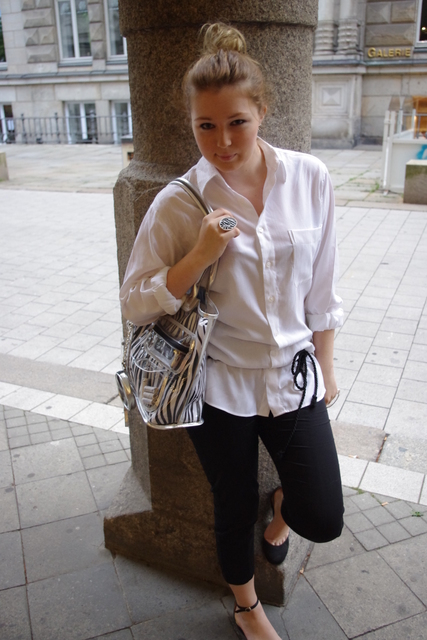 EN: Diverse magazines and online-portals already report about the coming trends for autumn and winter. Among others transparency will play a part. In the moment the temperatures are rather running in direction for autumn, so it’s time to face up with them. I choose lightly transparent shirt from my boyfriend and combined it with the see-through-zebra-pattern-bag, I got a few weeks ago and which is really an eye-catcher.