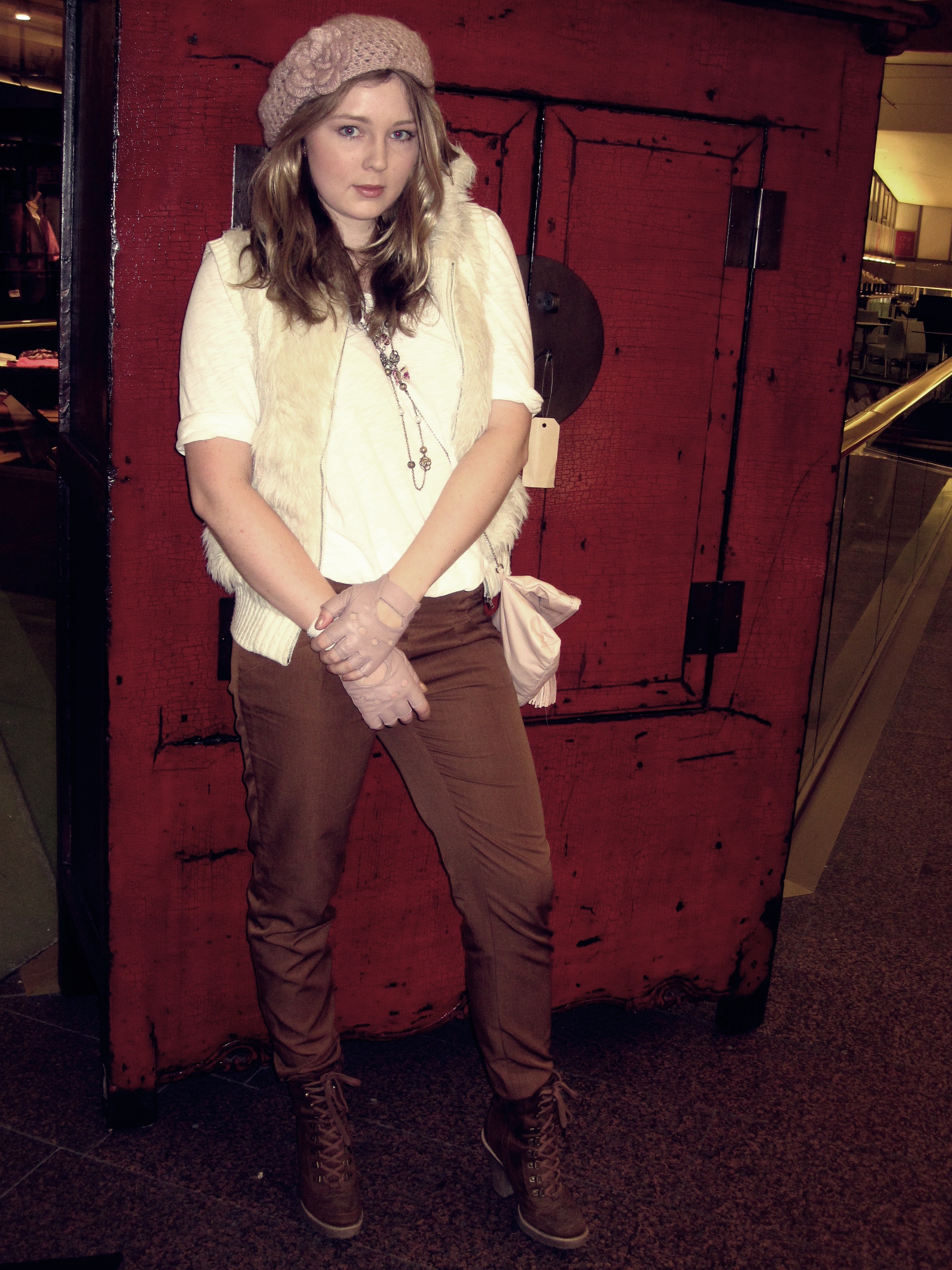 DE: Heute mal ein Outfit für kalte Tage. Meine Lieblingsteile dafür sind: Fake fur, Strickmützen und Schnürstiefel. Farblich finde ich Brauntöne mit Nude gemischt total super . Meine Hose ist vom Vero Moda Outlet in Polen. Zuerst wollte ich sie nicht kaufen, aber dank meiner beiden Shoppingberater Lynn und Lukas habe ich sie dann doch gekauft und sie ist nun eine meiner absoluten Lieblingshosen und das bedeutet schon eine Menge, denn mir gefallen nur selten Hosen (sind meistens zu unbequem!). Die Handschuhe sind auch neu und die waren sehr praktisch, um mein Verband am Handgelenk ein klein wenig zu tarnen (das Verband kommt übrigens vom sturen Versuch Möbel mit einem viel zu kleinem Schraubenzieher zusammenzuschrauben. Aber hey, ich hab’s geschafft, trotz Blasen auf der gesamten Handfläche und verdrehtem Handgelenk).