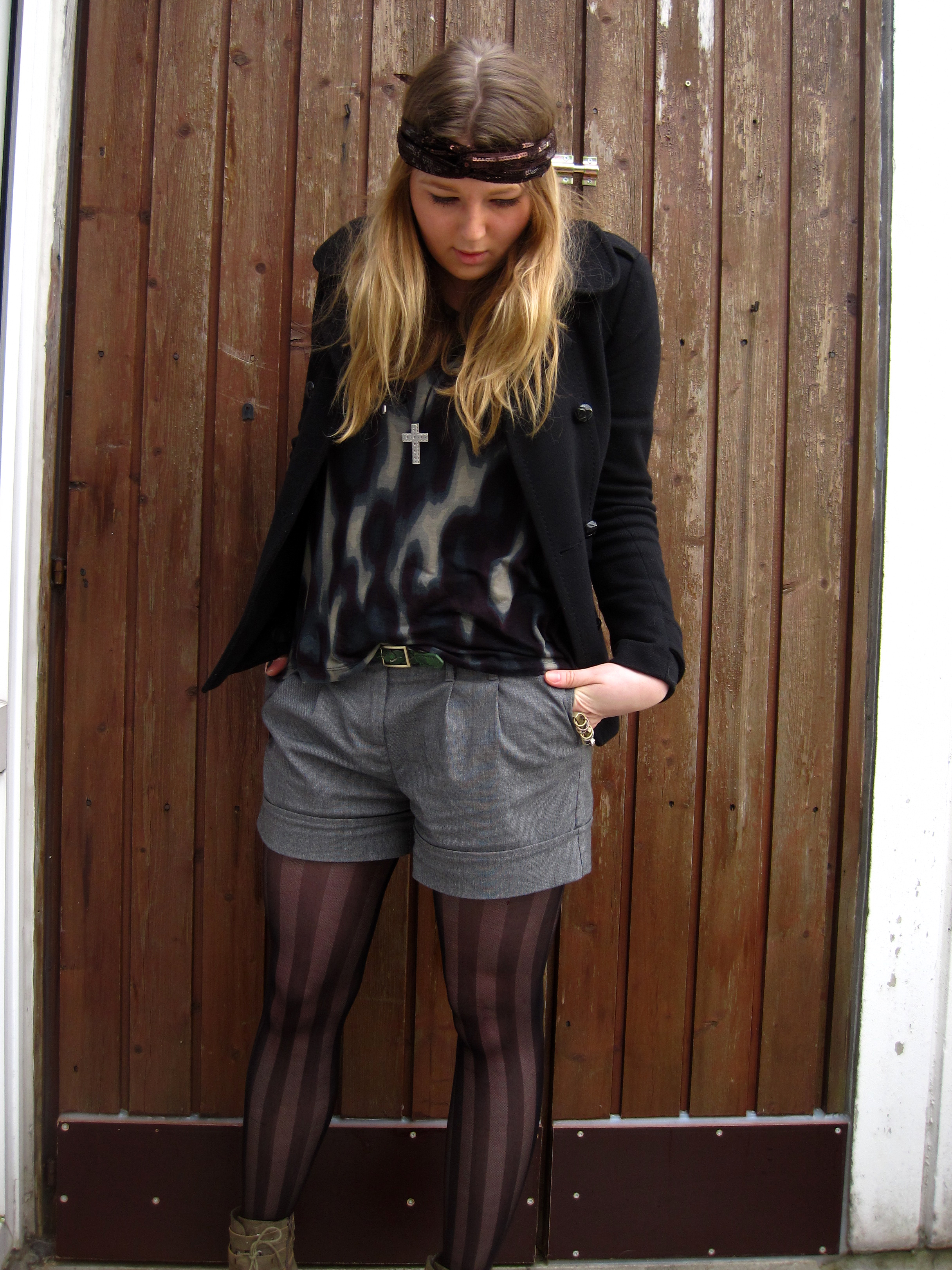 tights: romwe | shirt & jacket : H&M | headband: no name | shoes: via Otto | glasses: my brothers | belt : Cubus | necklace: Jette Joop | shorts: Pimkie | ring : H&M |