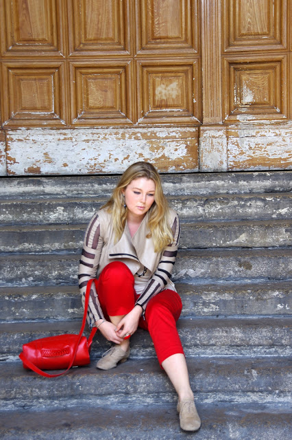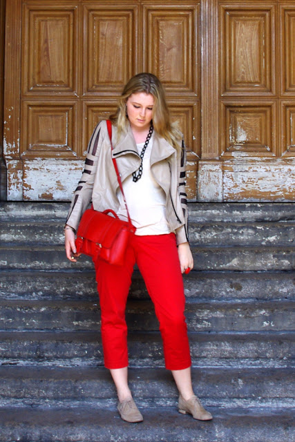That jacket is so amazing! I love red a tan together, too. Great color combination.