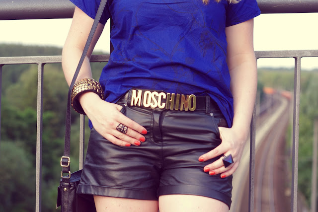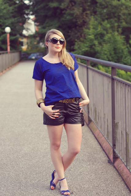 love that aqua blue top, it goes perfect with the leather shorts and stunning moschino belt! Gorgeous outfit! Enjoy the sun, have a nice day too.