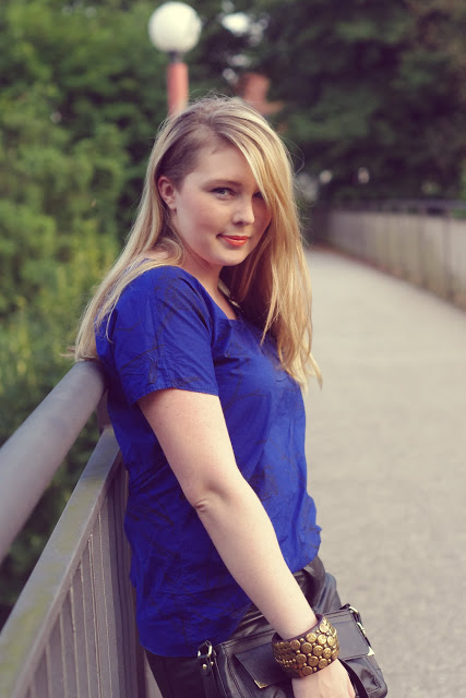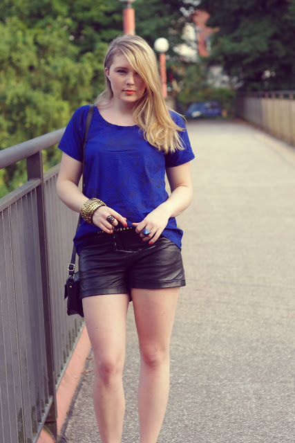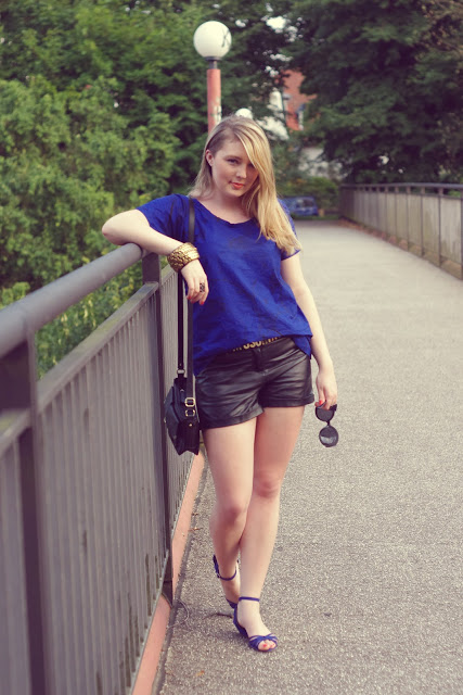 great style, like the leather shorts combined with the blue top and I'm a big fan of your belt:D