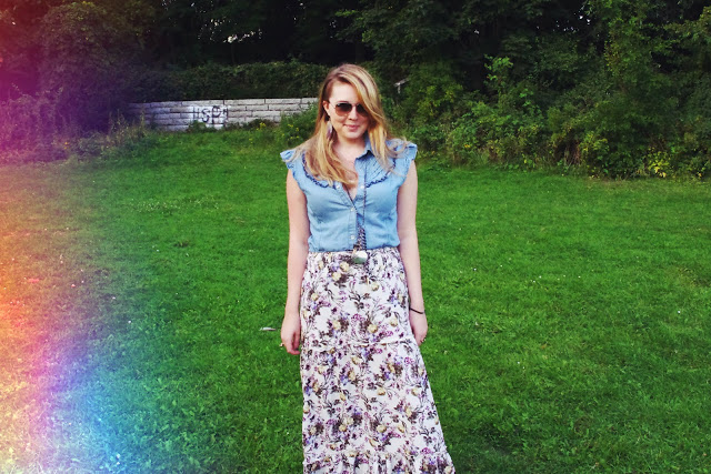 I like how you combine you new ray ban with jeans top and maxi skirt!!