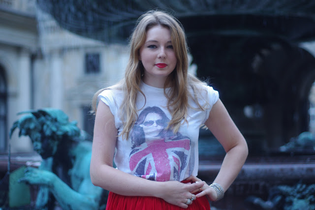 This outfit is absolutely perfect. I love that red skirt and the Union Jack shirt! You look so beautiful.