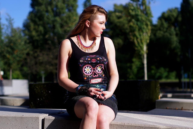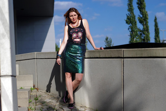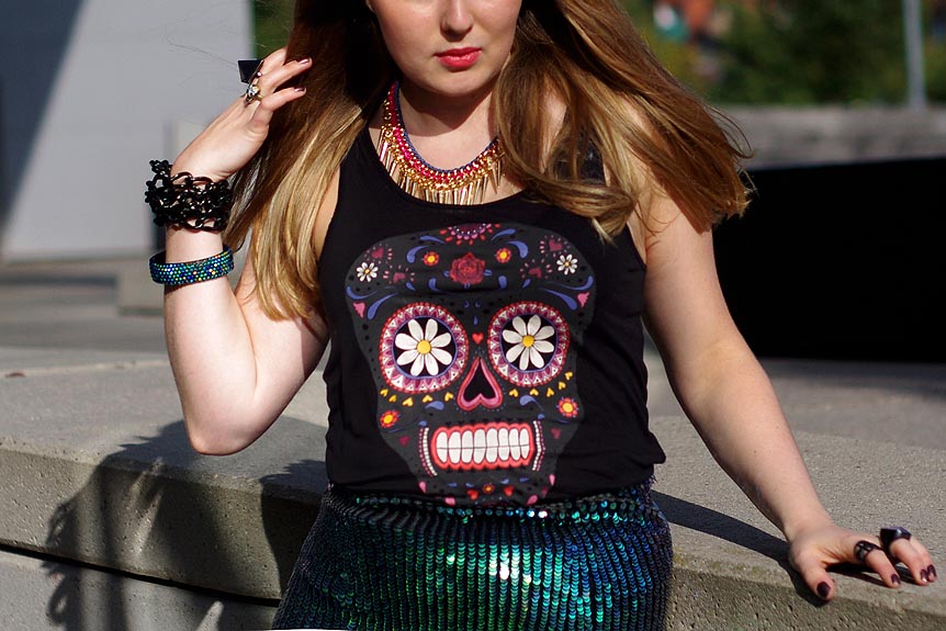 Today I show you new sequined skirt for the first time. I am so in love with it. It reminds me very much of the little meermaid, but with my skull vest and colorful necklace, this allusion is destroyed to the fullest.