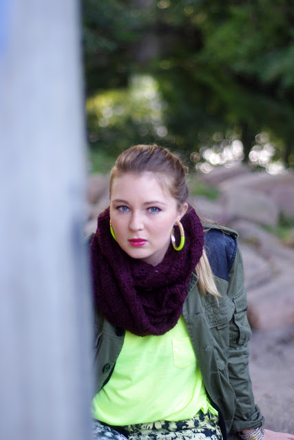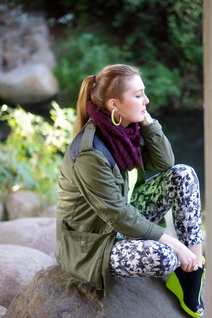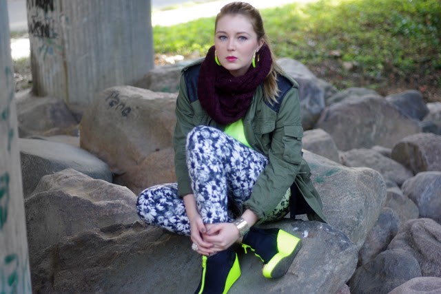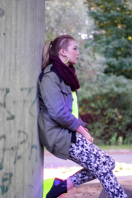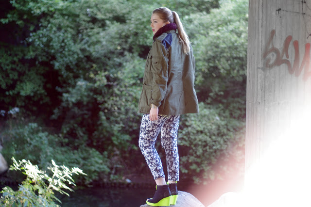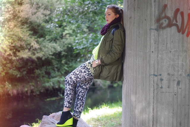 what an unpredictable combination: army jacket with floral pants & neon? so brilliant!!