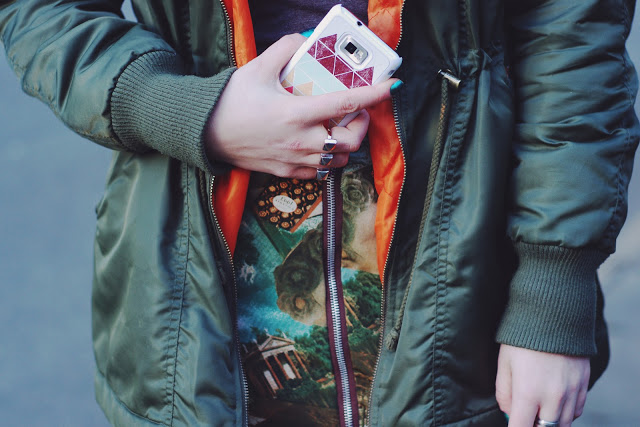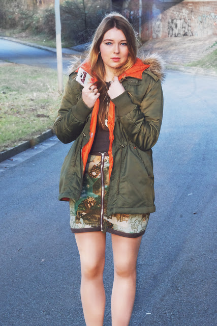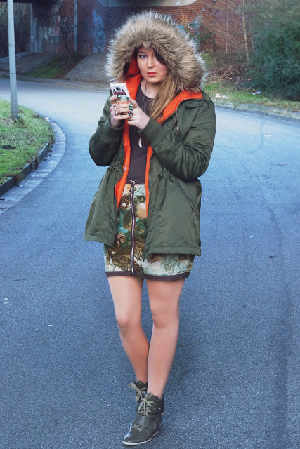 parka Asos | skirt: My own design | phone case: On your case   | wedges: New Yorker |
