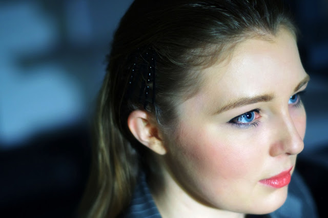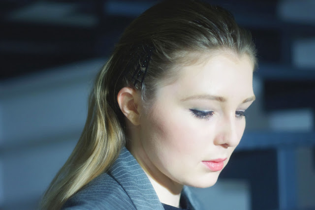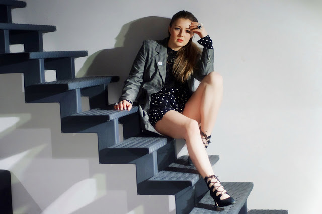 DE: Mein dritter Look für die Fashionweek Poland bestand aus einem Jumpsuit, den ich während meines 2. Semsters genäht habe und einer vintage Blazerjacke von meiner Mom. Ebenfalls aus ihrem Schuhschrank stibizt, habe ich die schwarzen Schnürheels, die der Trend für diesen Sommer sind. Gepackt vom vintage-fieber habe ich auch noch einen Wet-hair-look ausprobiert.