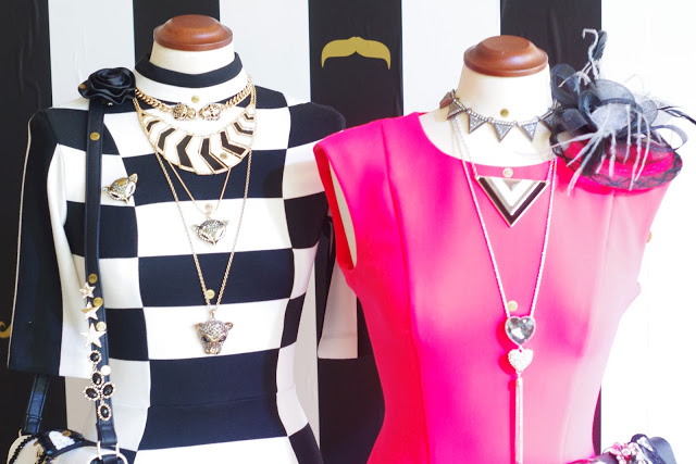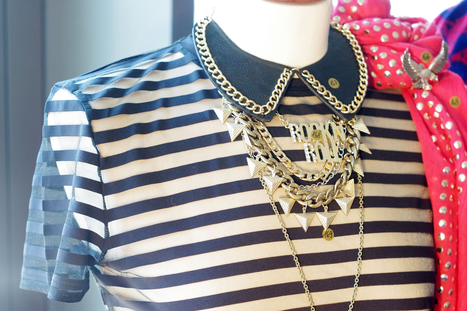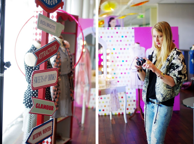 ENG: During Press Day I was invited to take a look at the Bijou Brigitte autumn / winter 2013 / 2014 trends. I was really surprised when I entered the Skylounge at the Side Hotel in Hamburg. The team has turned the place into a magical Circus from the 20ies showroom. Everthing was decorated true to the motto Circus Circus. The walls were striped or dotted, there was a candy buffet and a popcornmachine and the upcoming accessories for next season were presented on a knife thrower’s target and hanging on circus chairs.