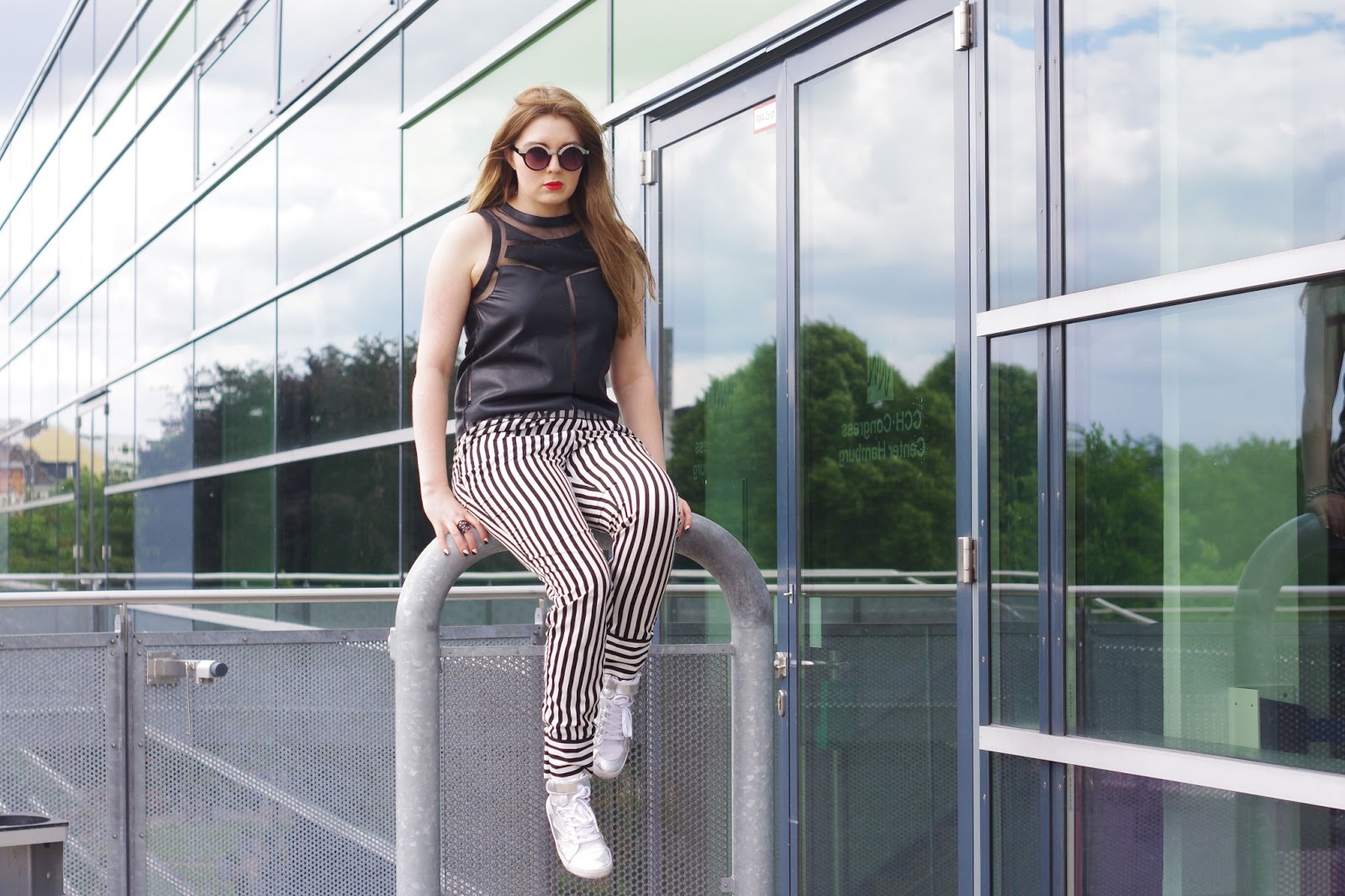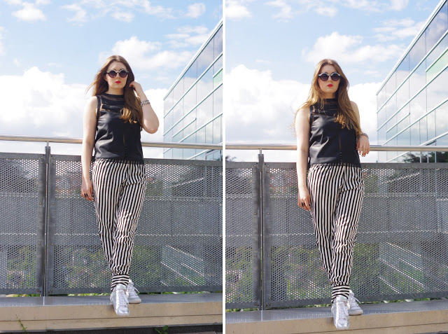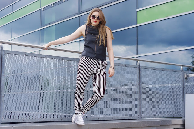Cut outs sind ein großes Thema diesen Sommer. Victoria Beckham, Prabal Gurung und Chloé haben ebenfalls geschickt cut outs in ihren Kollektionen verwendet. Der Schlüssel zu diesem Look liegt in der fehlenden Dekoration und Farbe. Es funktioniert am besten in schwarz oder weiß und ohne jeglichen Schmuck, da die cut outs schon dekorativ genug sind. Es ist eine neue Art von Minimalismus – einer der mir ausnahmsweise mal zusagt. Dennoch habe ich eine gestreifte Hose dazu kombiniert, ein Sommertrend, der sich sehr stark durchgesetzt hat (siehe Balmain, Marc Jacobs, Moschino, Dior). Dazu auch noch meine neue Sonnenbrille von Monki und weiße Sneakers (ebenfalls mit Mesh unterlegten cut outs), da ich mich so ganz ohne Accessoires nich wohlfühle (Ihr könnt von Overdivity nicht erwarten in einem Schritt von overdressed zu Minimalismus zu wechseln. Ich nähere mich mit kleinen Schritten an).