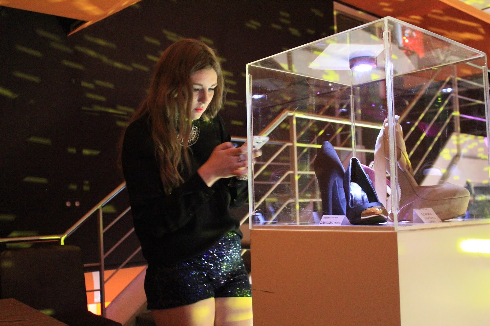 Während sich die 100 Mädels um die Schaukästen mit den Schuhen drängelten, genoßen wir den Begrüßungsdrink und versuchten den besten Schnappschuss für das Instagram Gewinnspiel zu knipsen. Meinen Lieblingsschuh wählte ich auf Grundlage der Höhe und Breite des Absatzes. Bevor ich mich getraut hätte ein paar dieser monströs hohen Stilettos anzuziehen, hätte ich erst einmal einen wie laufe ich in High Heels Kurs machen müssen. Nachdem ich mich dann für eine burgundy Sandale mit Plateau und Metallverzierung auf dem Absatz entschieden habe, stürmten wir die Tanzfläche – wie das aussah seht ihr im Video.