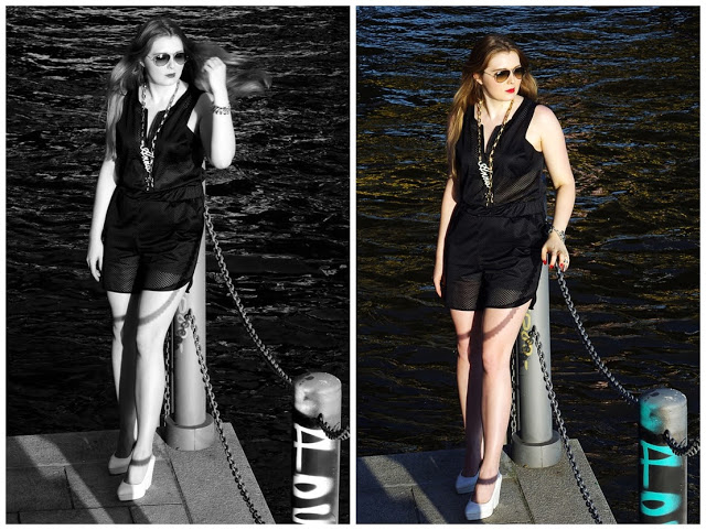 adr black H&M heels jumpsuit mesh monki ray ban statement necklace sunnies white