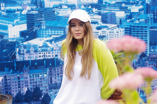 ENG: Although my look is really summery, there is a autumn trend behind it: Sweater over skirt. Céline, Christopher Kane and Sportmax showed us how it works: Wear a cozy oversize sweater over an A-line skirt and you are ready. For autumn of course with tights and boots.
