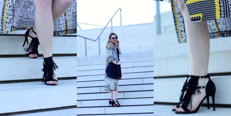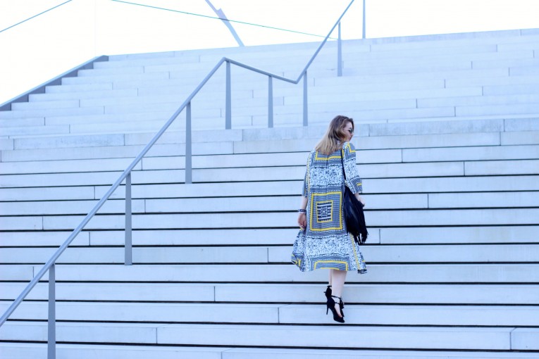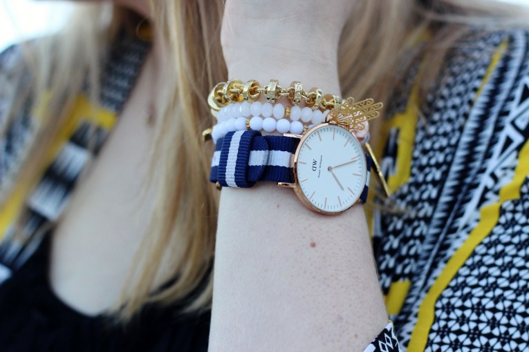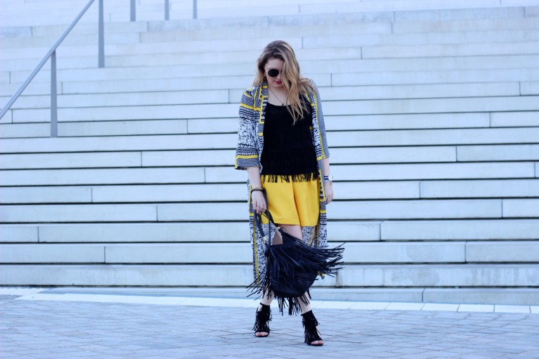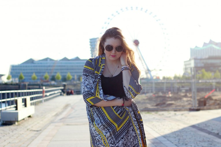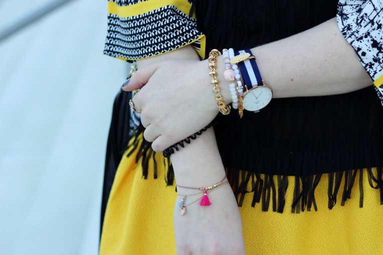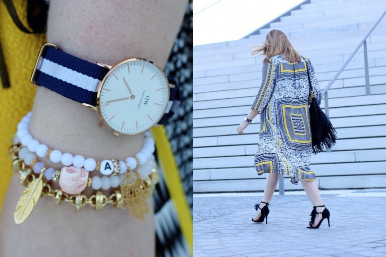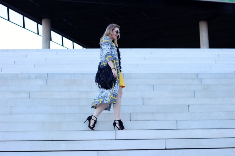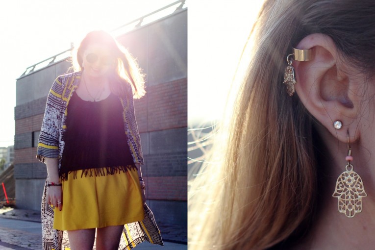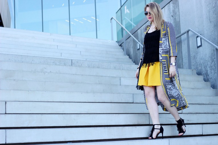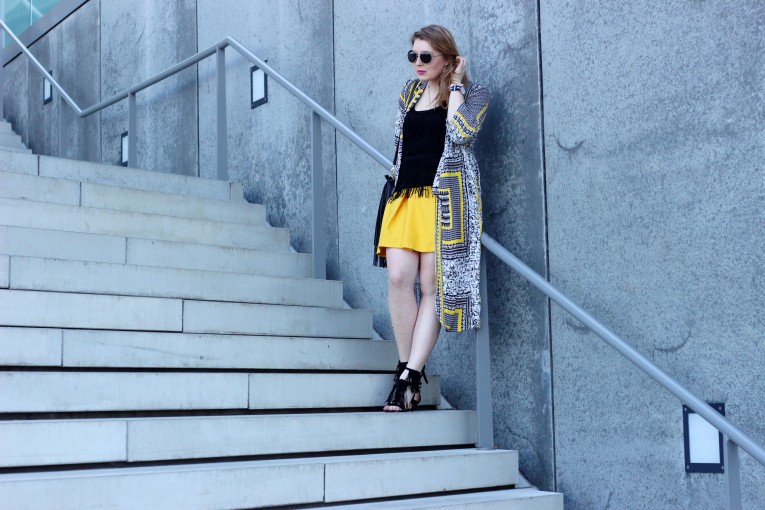 top: Gina Tricot | earring: I AM | skirt: H&M | heels: Just Fab | kimono: River Island | watch: Daniel Wellington* | white bracelets: Münchner Arroganz* | gold bracelet: Lola & Grace* | bag: H&M | sunnies: Cubus