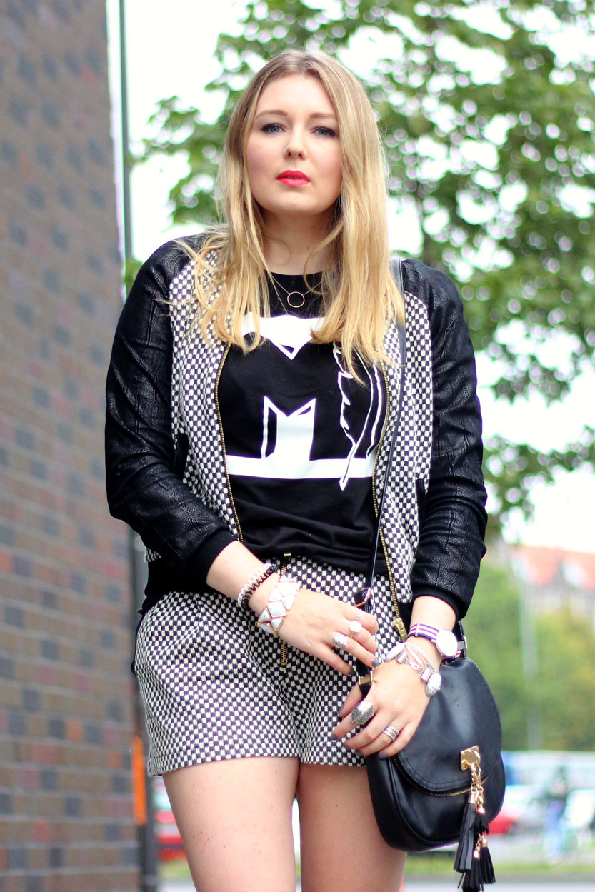 blouson, shorts, shirt: Staff by Maff | shoes: Peperosa* | bag: Bijou Brigitte* | rings: SIX, Pandora