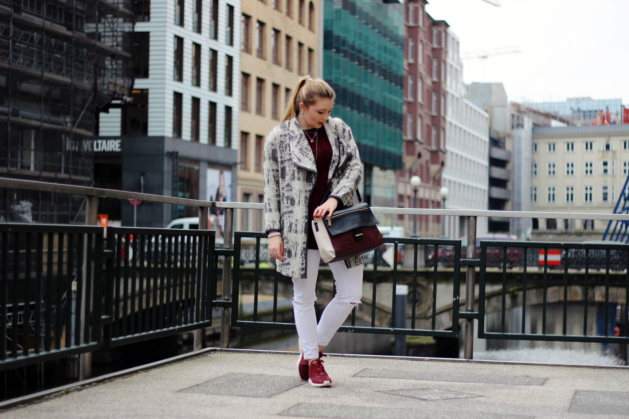 burgund, marsala, trendfarbe, marble, marmor, jacke, ripped jeans, weinrot, Adidas Flux mit Struktur, XL Schal, Hamburg