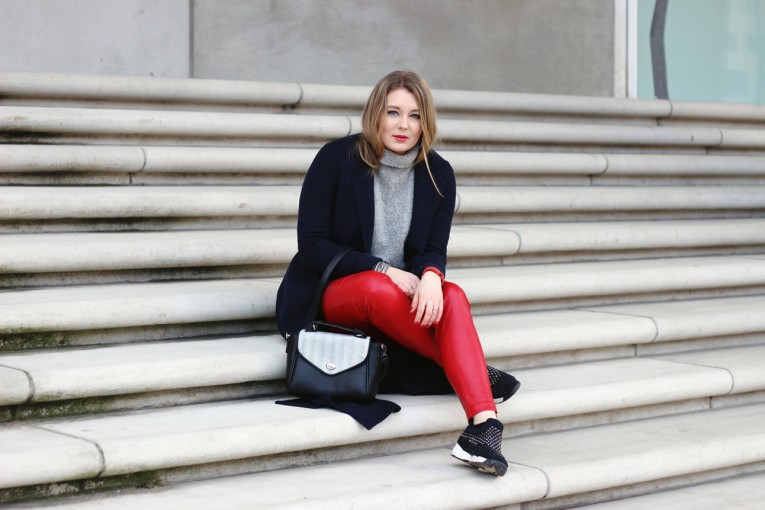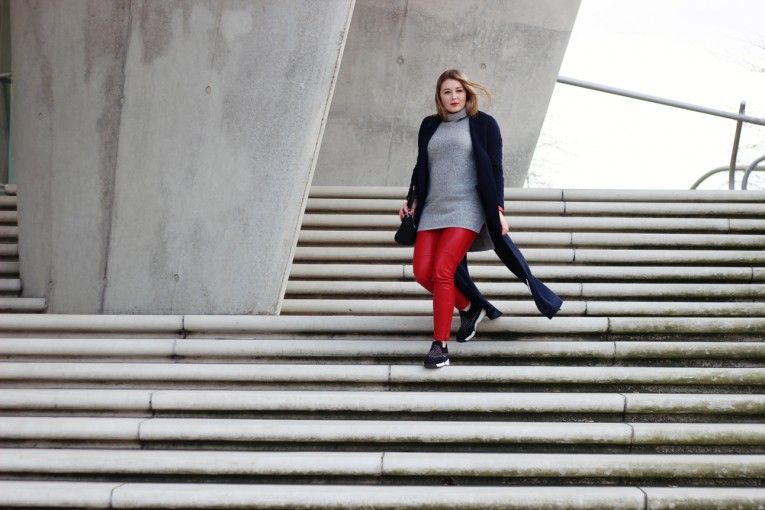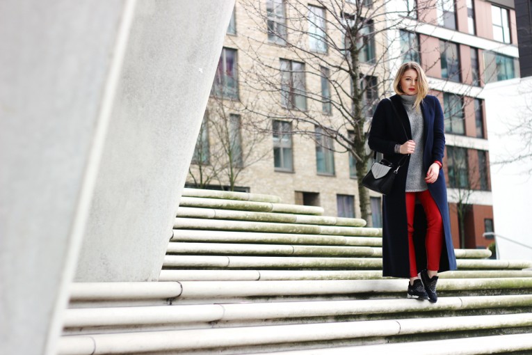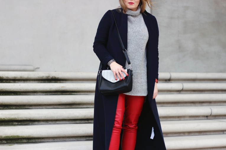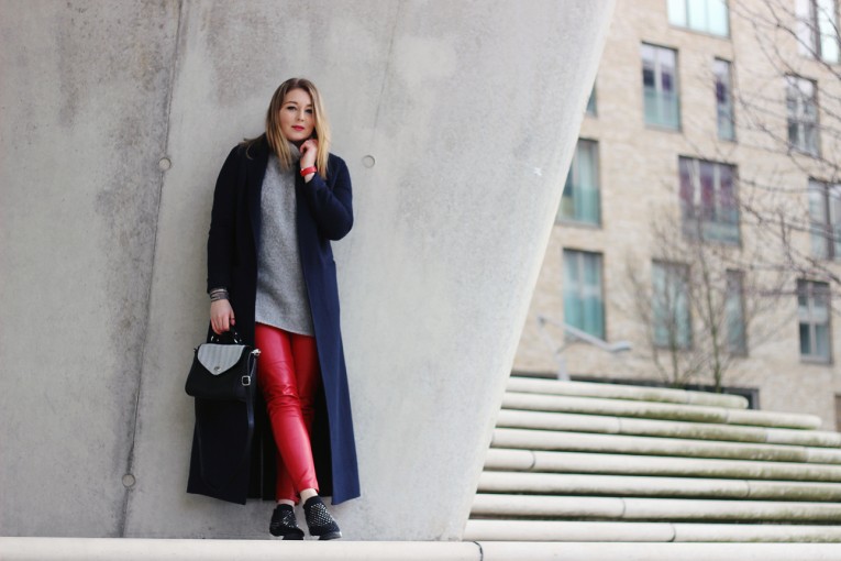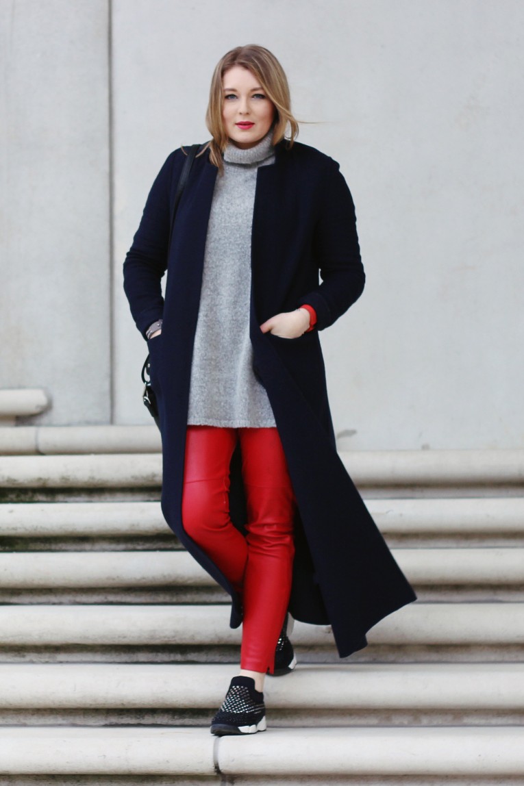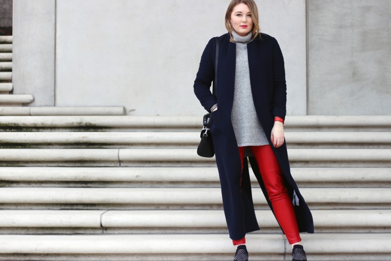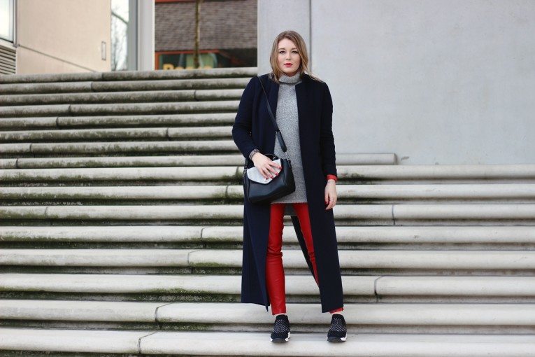 fashionblogger long coat modeblogger outfit pinko pinkostars red leather pants rote lederhose shine baby shine streetstyle turtleneck zara Mantel blau