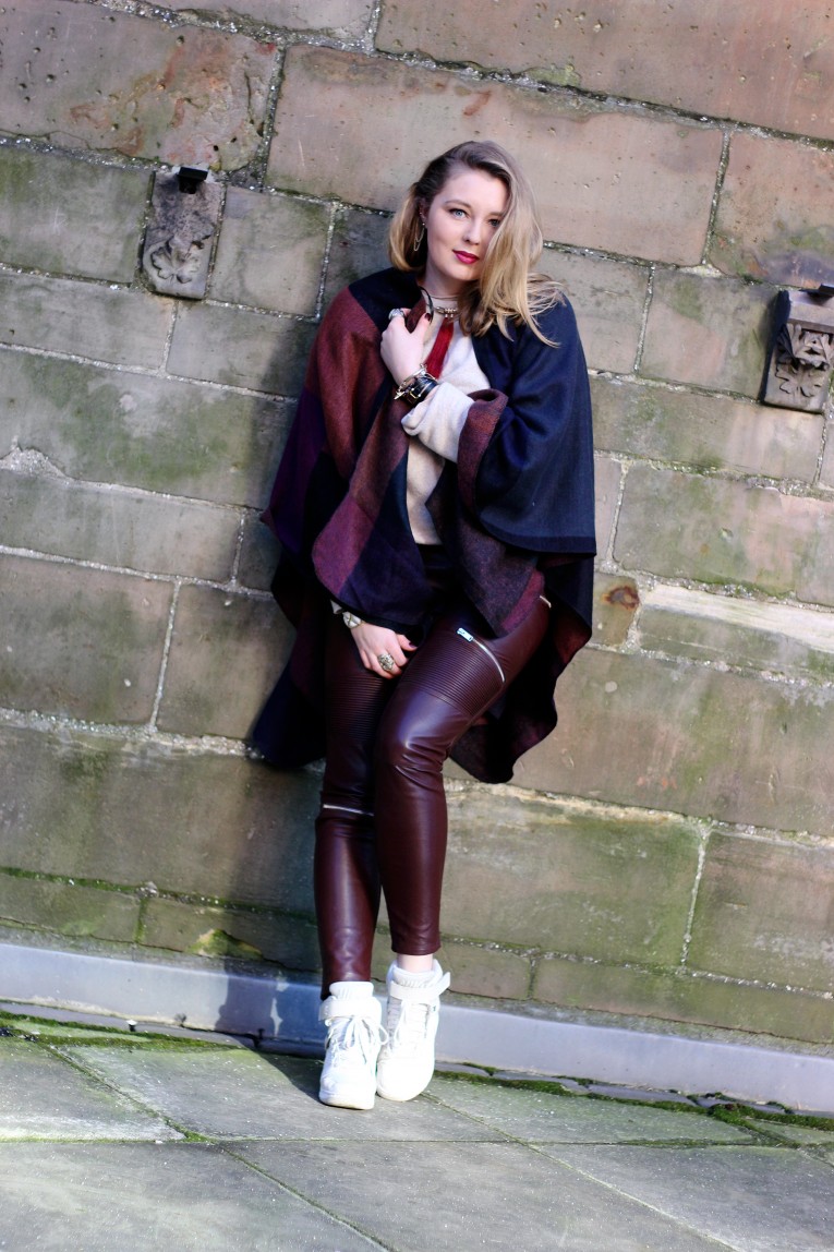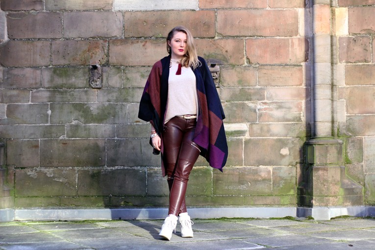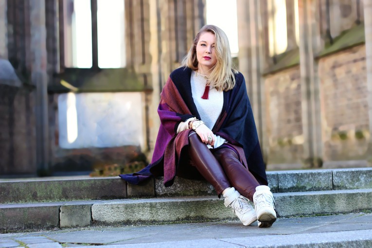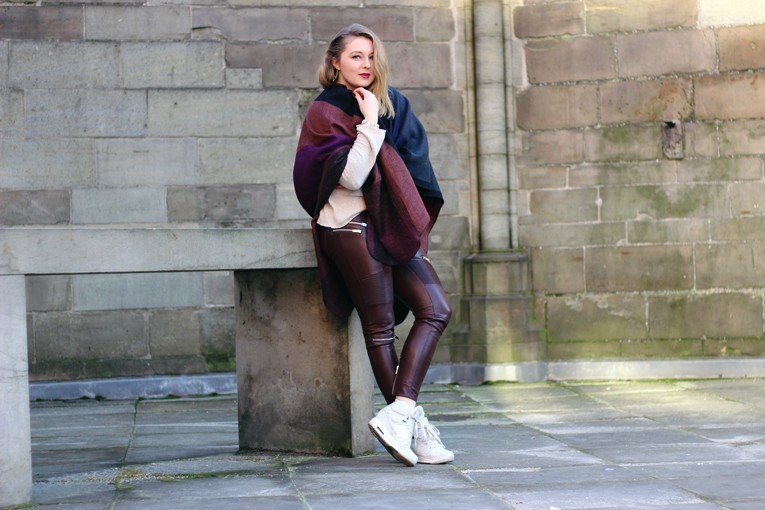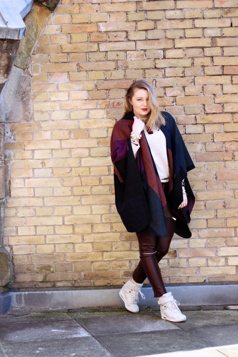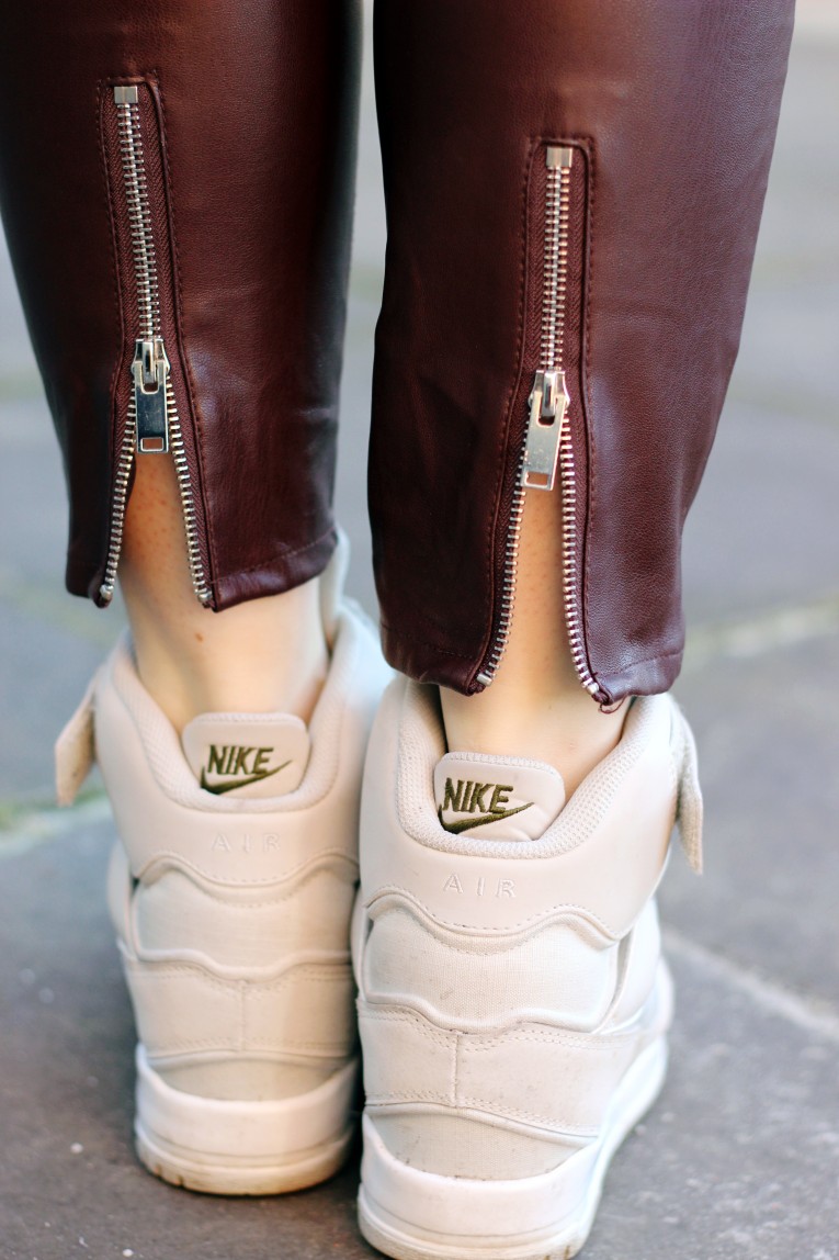 bikerhose mit zippern burberry look alike burgund cape frühling hamburg helle sneakers keilabsatz Nike schuhe lederhose marsala modeblogger nike wedges spring weinrot