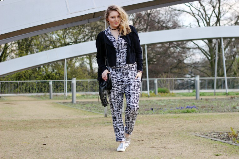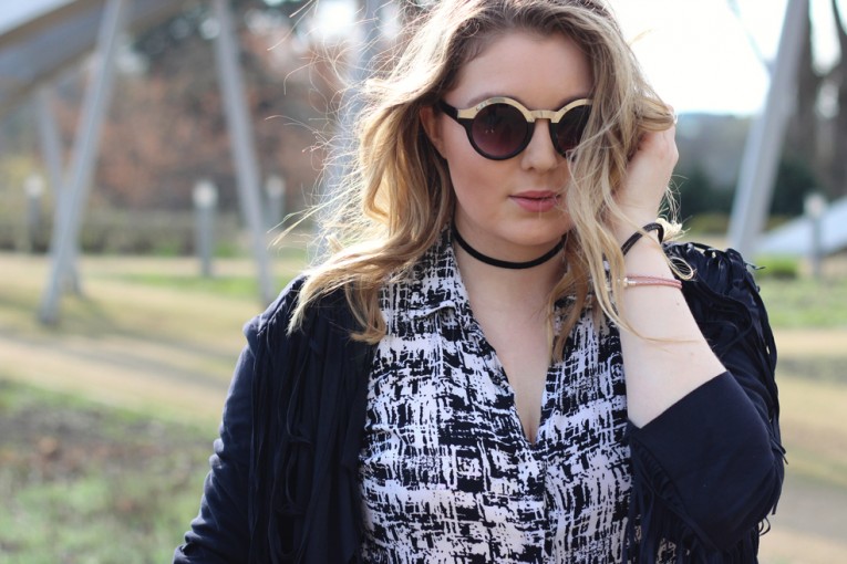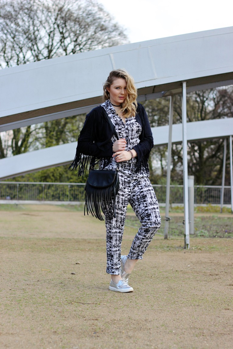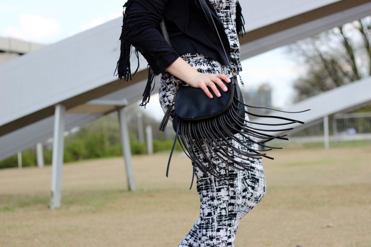 EN: This weekend the festival season has started in the California desert. This refers, of course, to the Coachella Festival. If you looked through your social media feed the last days, you have probably seen many celebrities and bloggers in their freaky Boholooks. Everyone, who likes the bohemian style, could find a infinite source of inspiration on Snapchat and Instagram. So much festival vibe is infecting and so I’ve been thinking about a look, which I can also wear here – in the quite stuffy north. To avoid attracting too much attention in gray Hamburg, I have decided to stay away from any colors in this look. The monochrome outfit gets its festival upgrade from the fringe jacket – and bag.