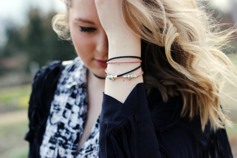 Auch beim Schmuck muss man für ein Coachella Styling nicht zwangsläufig auf Statementketten oder Federn setzten. Das schwarze Lederhalsband und die beiden Lederarmbänder von Pandora, sorgen für genau die richtige Prise an Hippiefeeling, ohne dabei kitschig oder überladen zu wirken.