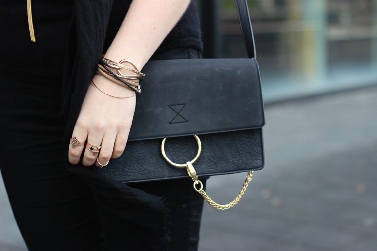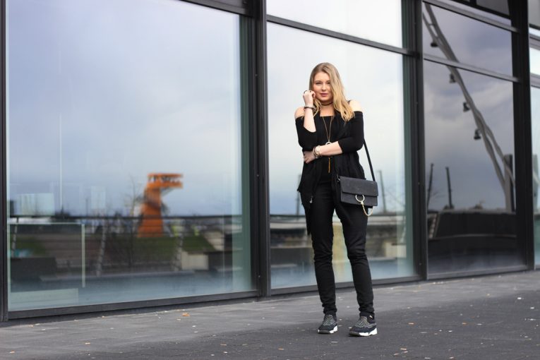 In der Mode geht es darum, Spaß mit verschiedenen Trends und Stilen zu haben, mit ihnen zu spielen und dabei auch mal ein Stil Risiko einzugehen. Ein komplett schwarzes Outfit hingegen ist immer eine sichere Wahl. Um den schwarzen Basic Look nicht ganz unscheinbar wirken zu lassen, füge ich kleine Highlights wie strassbesetzte Sneakers von Pinko oder goldene Accessoires hinzu.