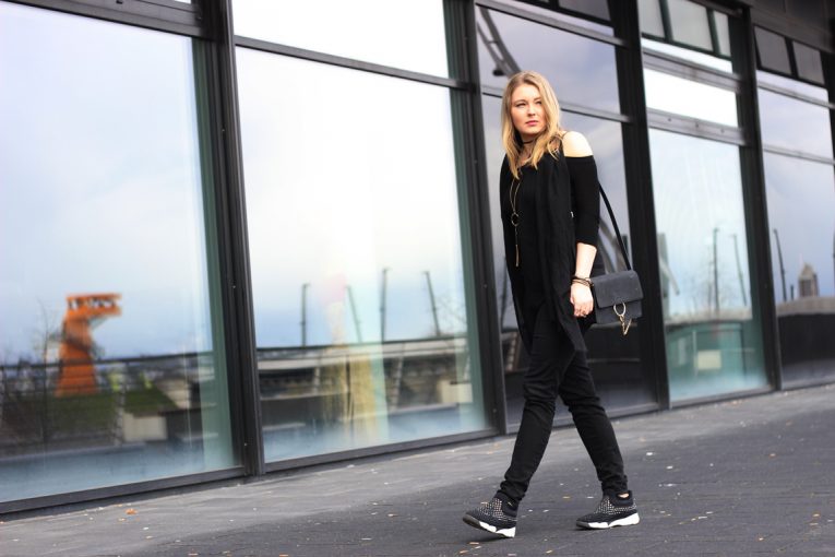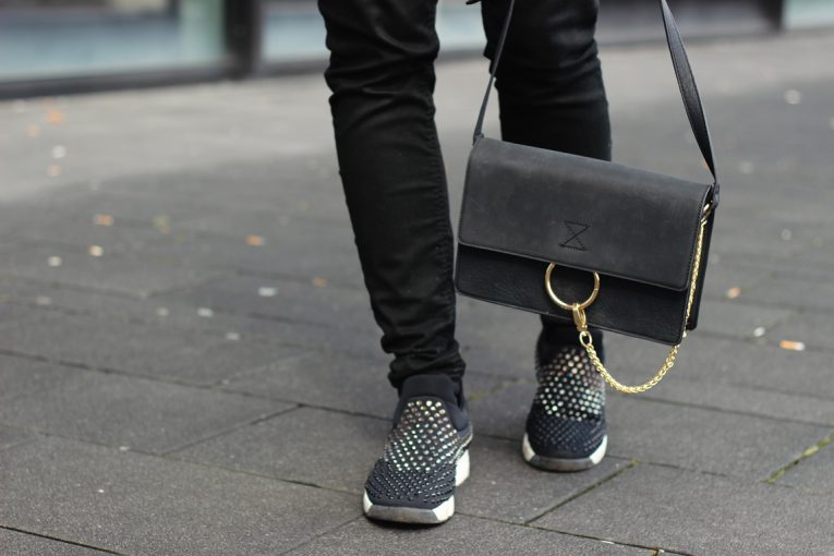 Fashion is about having fun, while experimenting and taking style risks. A completely black outfit, however, is always a safe choice. In order not to let the black basic outfit look quite unimpressive, I add small highlights like rhinestone studded sneakers from Pinko or golden accessories.
