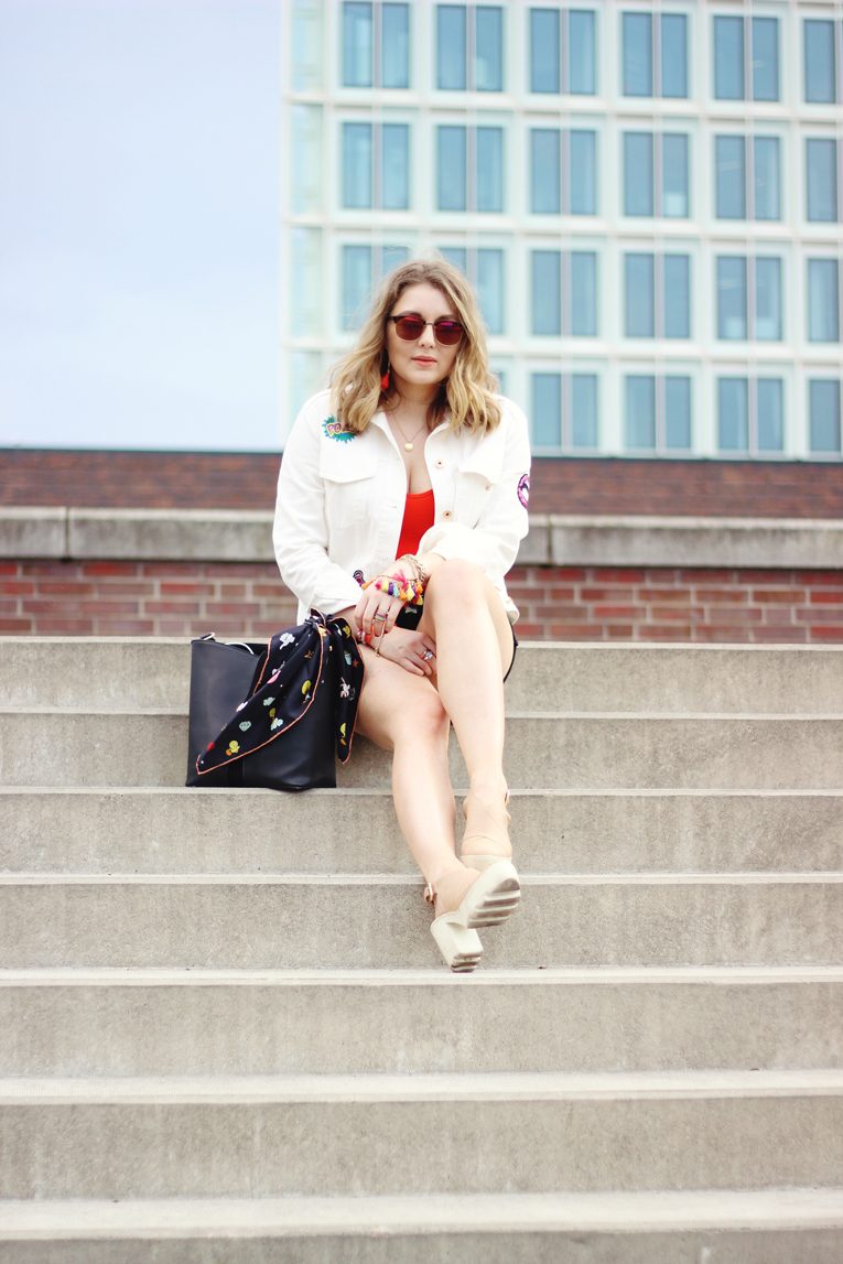 jacket: H&M & DIY | bag: Mohito (similar here) | shoes: River Island | top: H&M (similar here) | bracelets: six | scarf: Codello (similar here) | shorts: H&M (similar here)