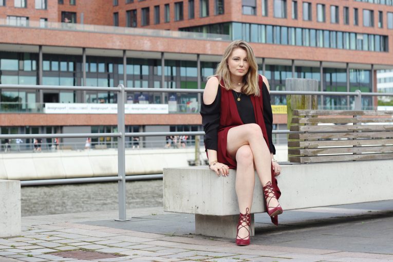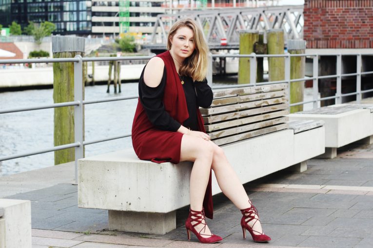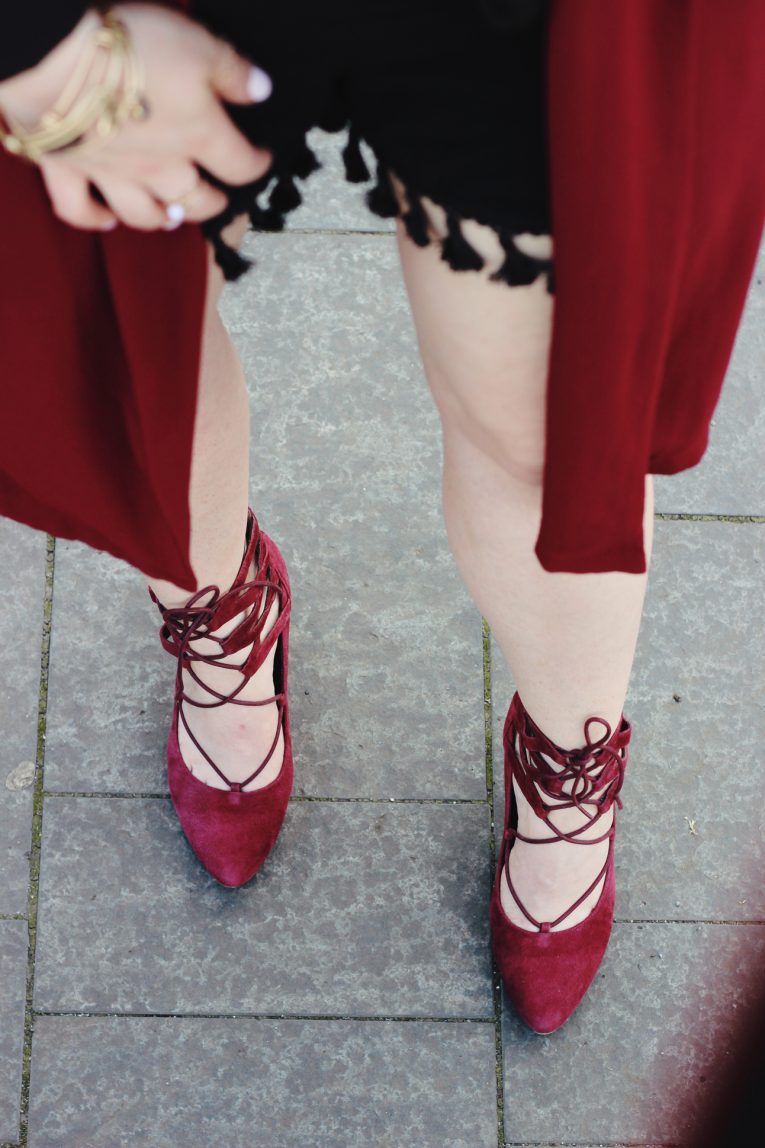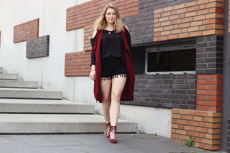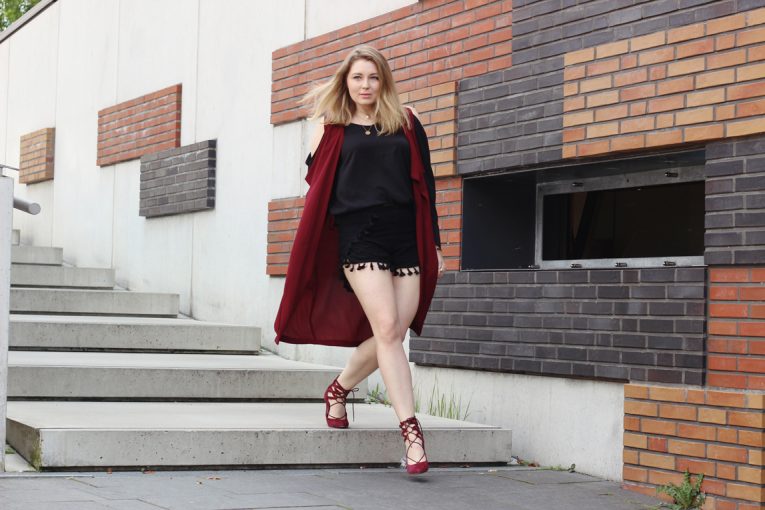bluse mit cut outs burgund fashionblogger hamburg laced heels modebloggger off shoulder quasten shorts schnür schuhe schwarze shorts tamaris urban leaves weinrot