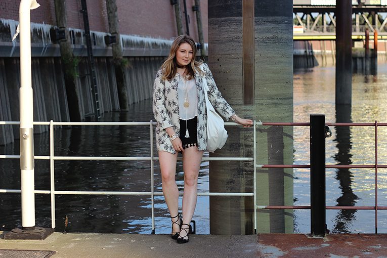 Click here to see more pictures: Palm coat, lace flats and tassel shorts