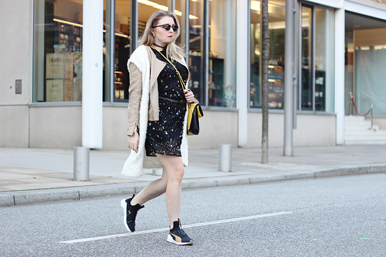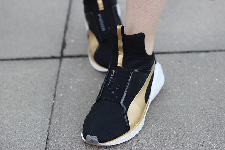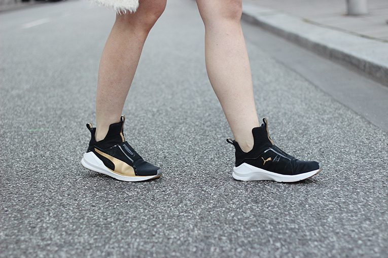Schwarz, weiß, gold – die goldene Variante der Puma Fierce ist viel zu stylisch, um sie ausschließlich im Fitnessstudio zu tragen. Diejenigen, die letzten Monat meinen Blogpost zum Thema Sportmotivation gelesen haben, wissen zudem, dass dies sowieso eine Verschwendung wäre. Wer nochmals nachlesen möchte, wie ein gemeinsamer Workoutversuch von mir und meinem Freund endete kann, klickt hier: „Sporty Couplegoals„.