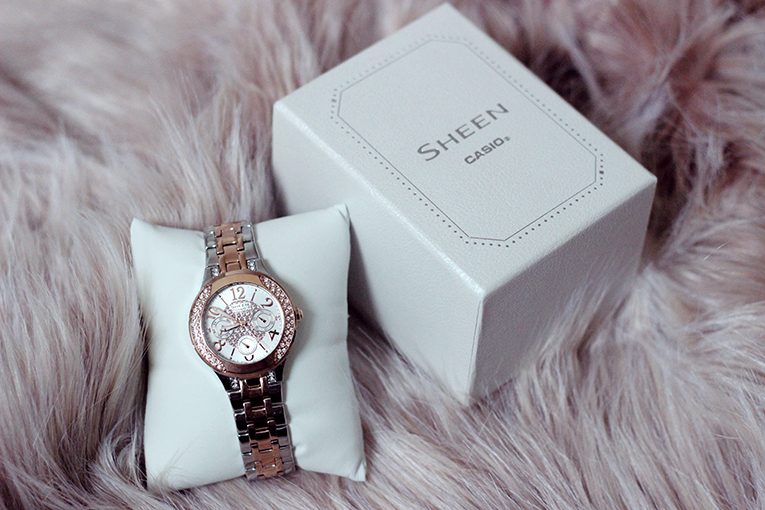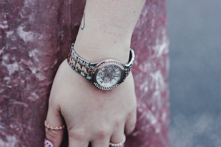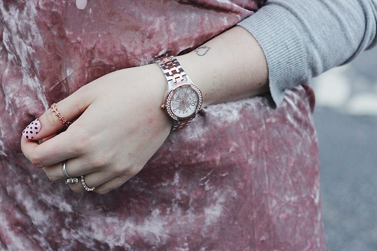 Ich selbst trage auch sehr gerne Sheen Uhren. Besonders das Modell welches ich hier verlose, kann man gut zu vielem kombinieren. Da die Armbanduhr silber und roségold ist, passt sie zu mehreren Looks. Weiter unten könnt ihr auch sehen, wie ich sie momentan am liebsten kombiniere: zum grauem Rolli und altrosa Samtkleidchen.