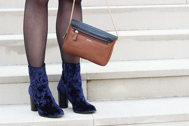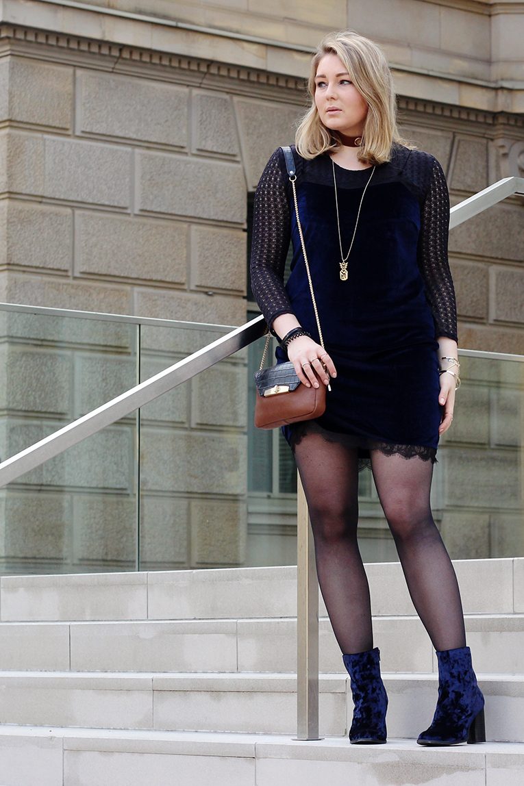 Der Stoff velvet ist nun sehr beliebt. Die Schuhen passen zu dem Kleid sehr perfekt. Das aldige Blau lässt dich charmanter aussehen. Hammer Outfit.