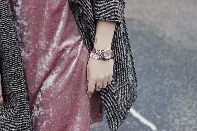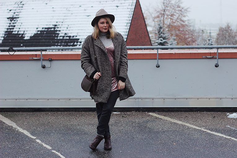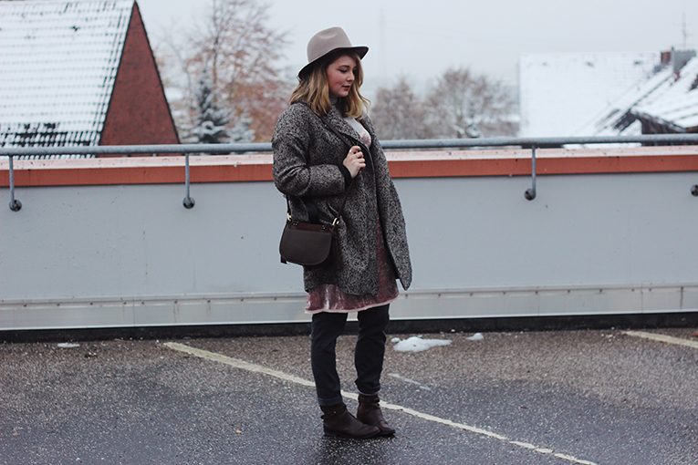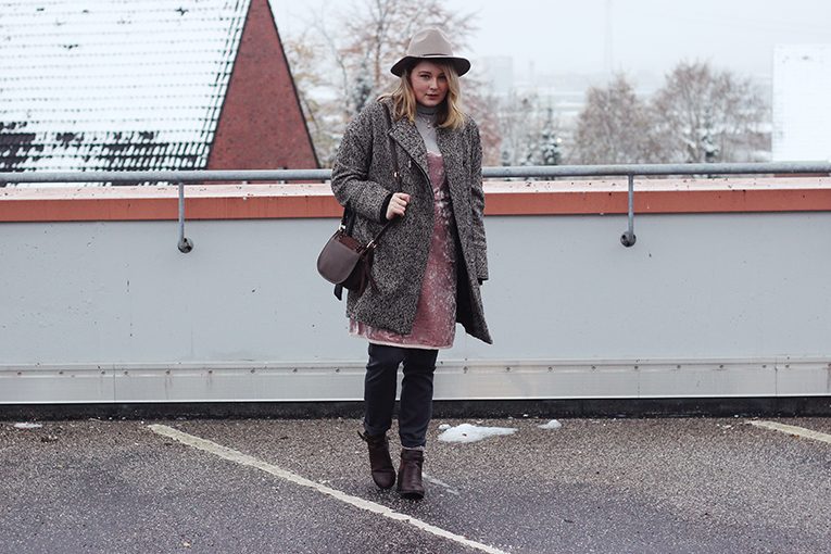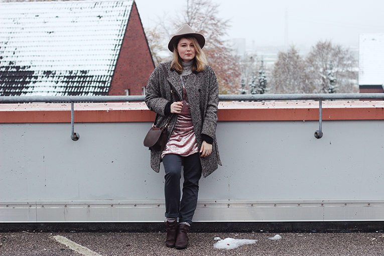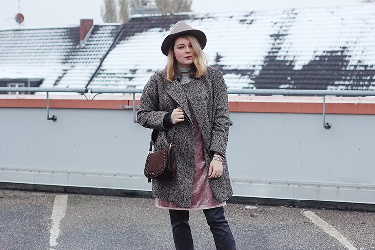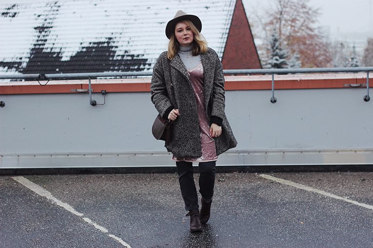 grauer tweed mantel hamburg herbst kleid über rollkragenpullover kuschelsocken loevenich modeblogger rosé s.oliver samt samt kleid slipdress socken trend socks trend trägerkleid winter wintersocken