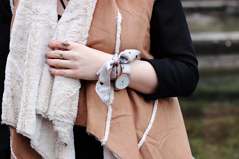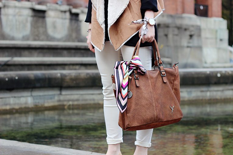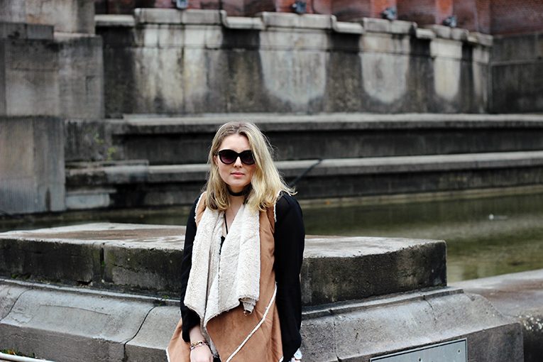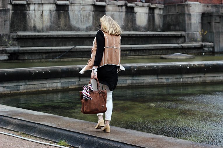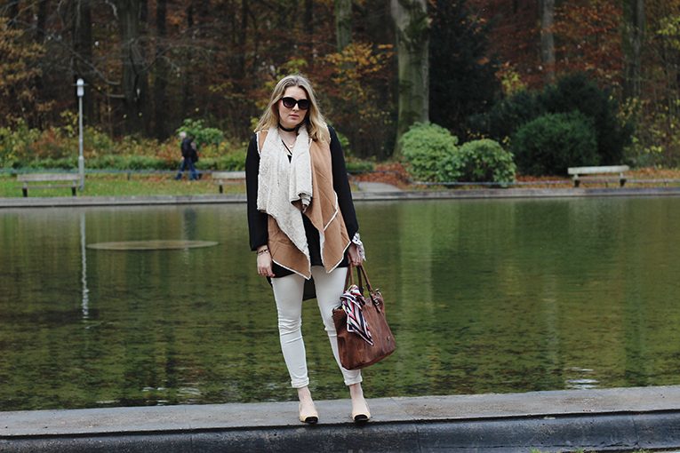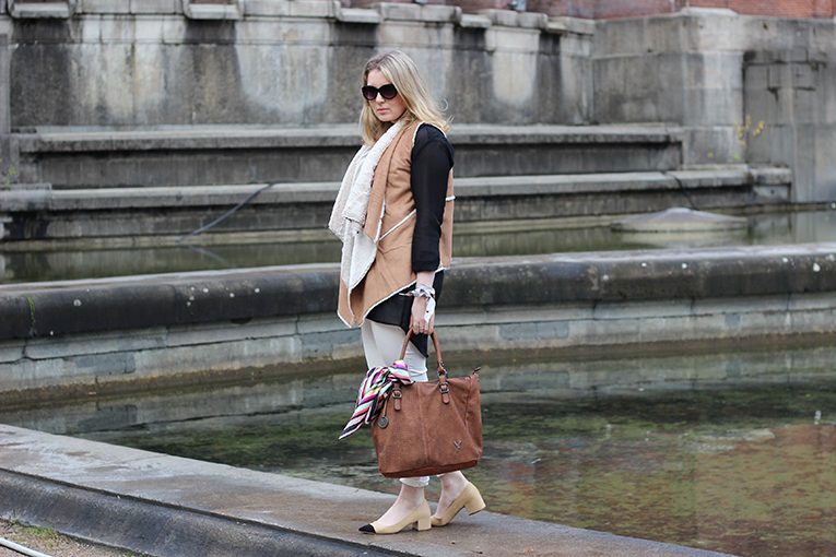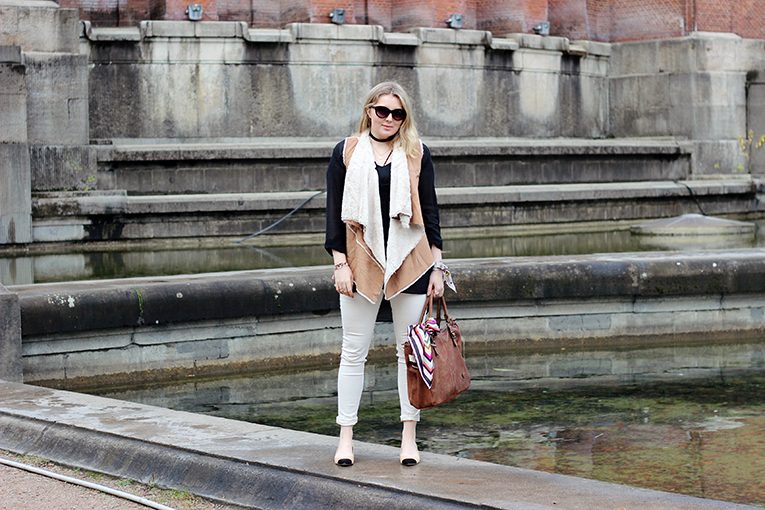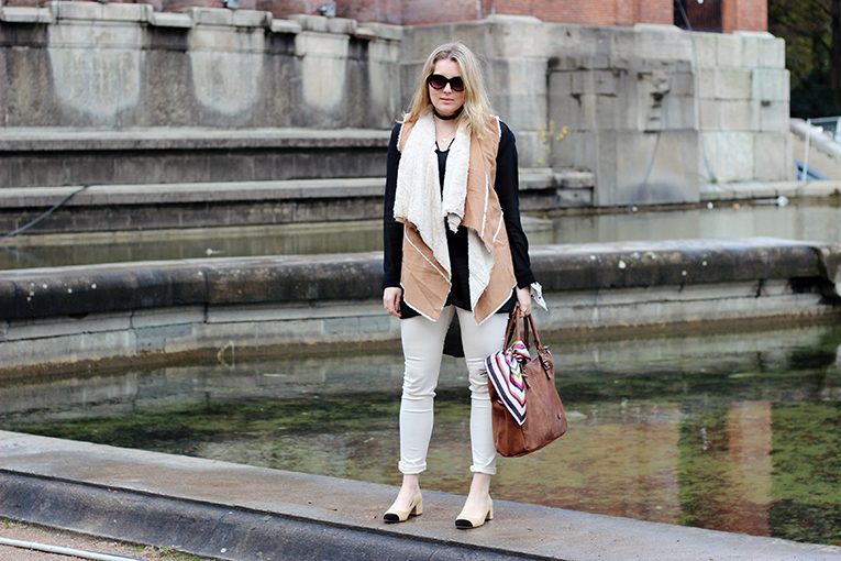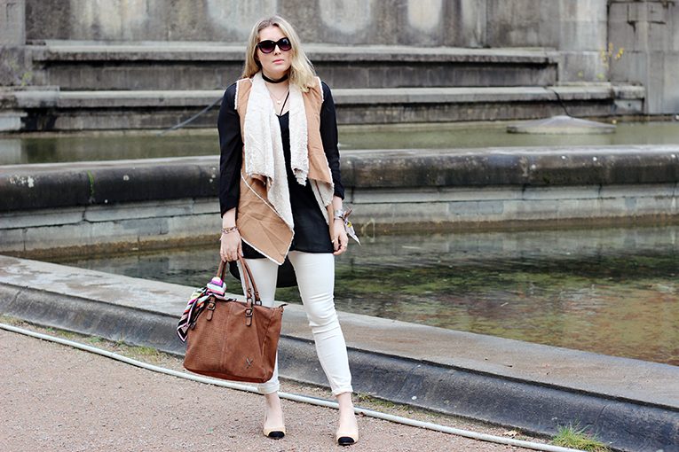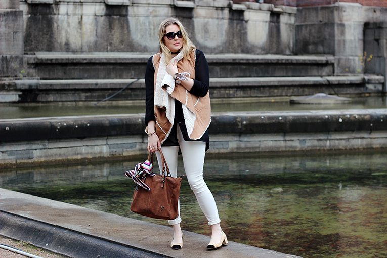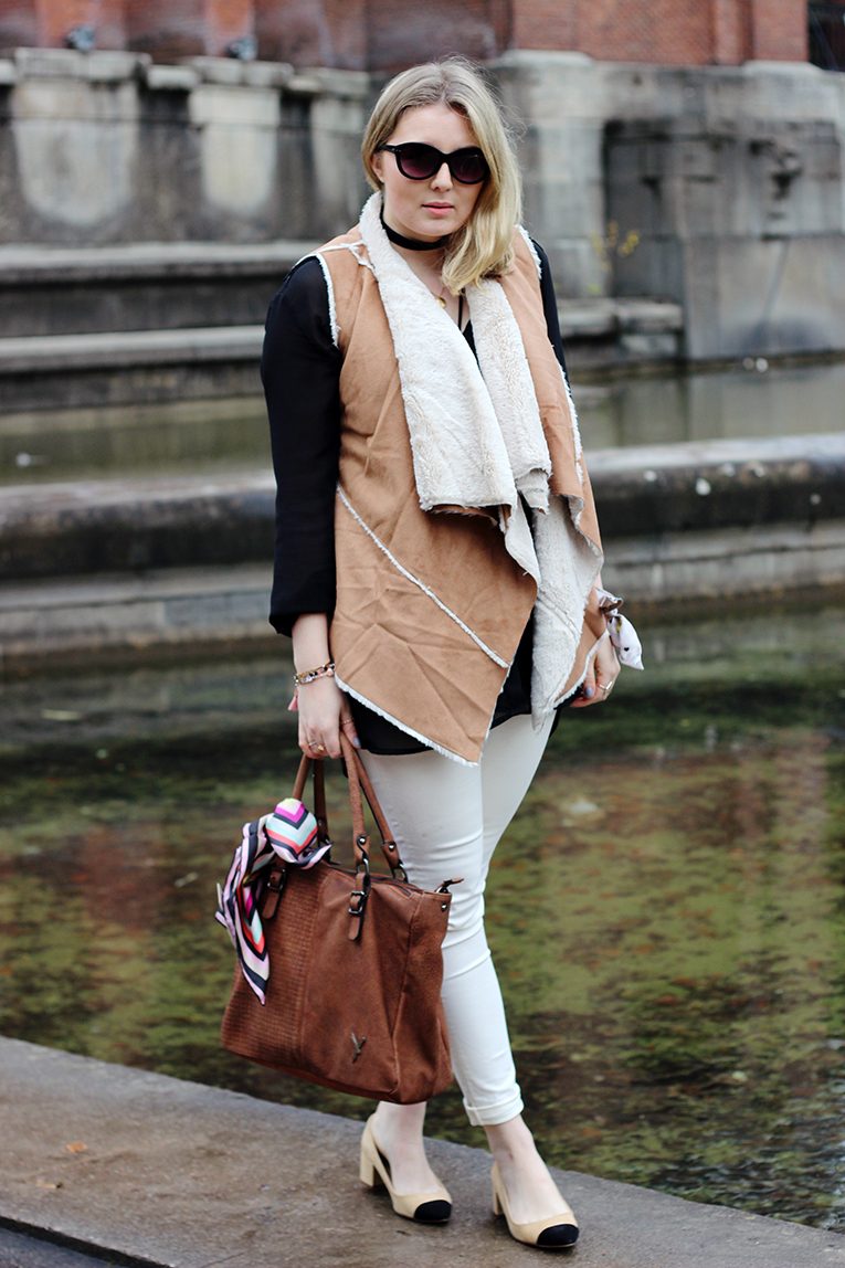 Vielleicht habt ihr noch ein ähnliches Teil mit (Fake Fur)- Lammfell im Schrank hängen? Jetzt ist der richtige Zeitpunkt dieses Teil hervorzuholen und wintertauglich zu stylen. Die Weste muss dabei nicht immer zum schicken Outfit getragen werden. Stilbrüche mit sportlichen Details, Lagenlook oder auch verspielten Kleidchen passen ebenfalls gut zu einer Weste in Camel Farbe. Meine liebste Kombination: skinny pants und eine lange Bluse. An kälteren Tagen wähle ich einen groben Strickpullover dazu.