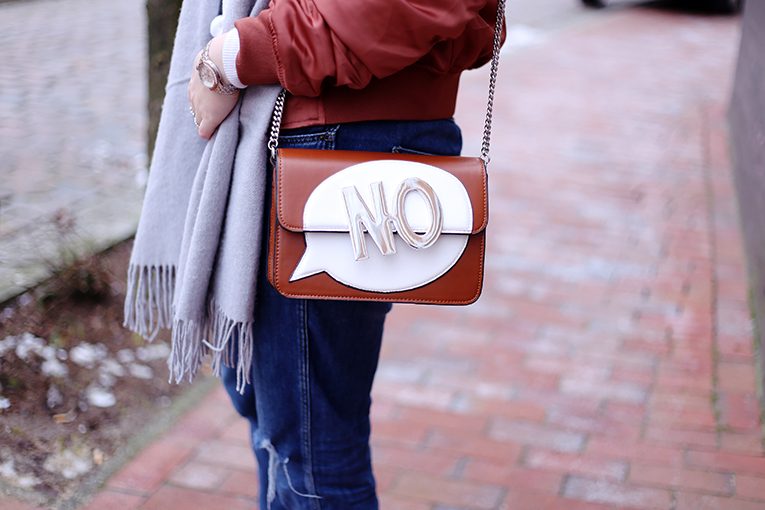bomberjacke bomberjacke aus satin cut out jeans denim jeans Netzstrumpfhose ripped jeans statement statement bag