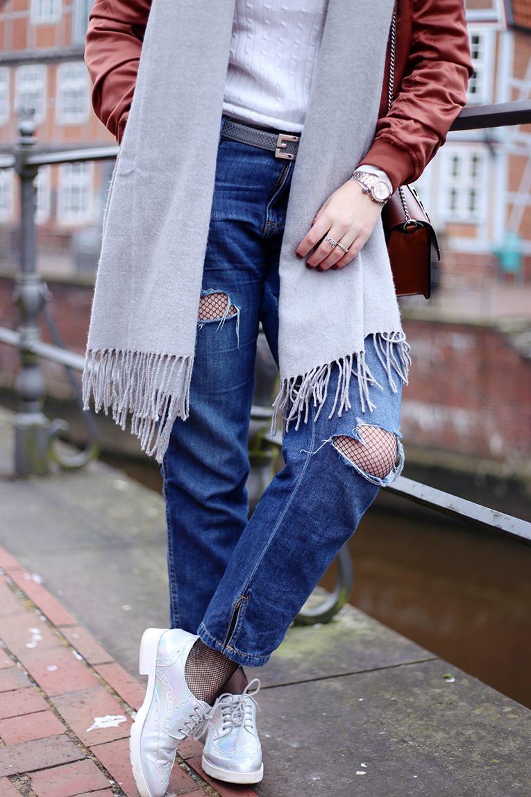 copper jacket, gina tricot, pullover mit strickmuster, gian tricot schal, silber schuhe, holografische flache Schuhe, Schuhe in silber mit Profilsohle, Pilotenbrille, Zara, Zara Brillenfasssung, Pilotenbrille, Brillen Trends, XL Brille Metall, FIligrane Brillengestelle, Stade, Modeblogger, Bloggerin Hamburg, Stader Altstadt, ripped jeans, Netzstrumpfhose, Net tights, fishnet tights
