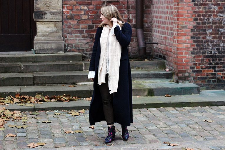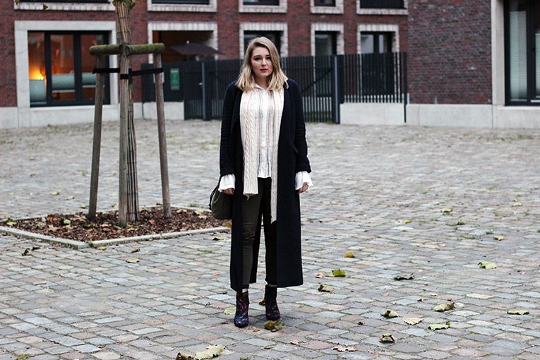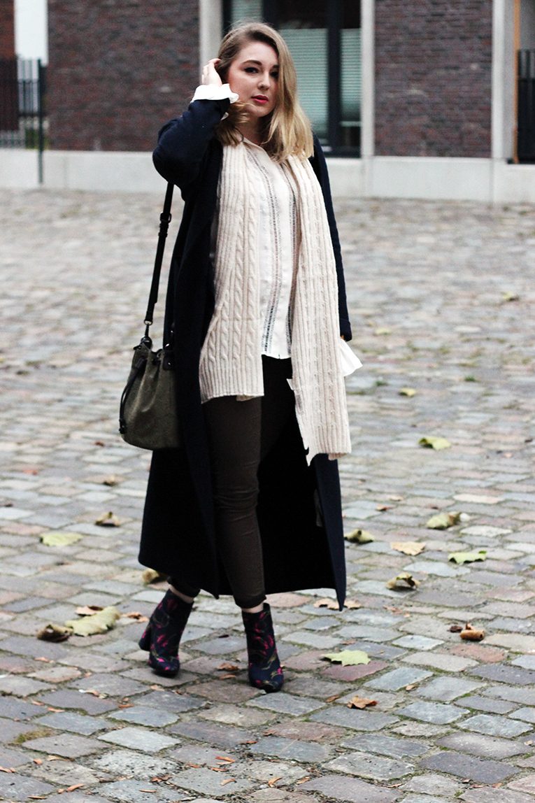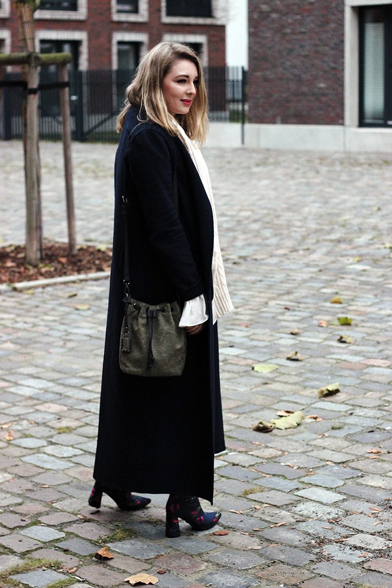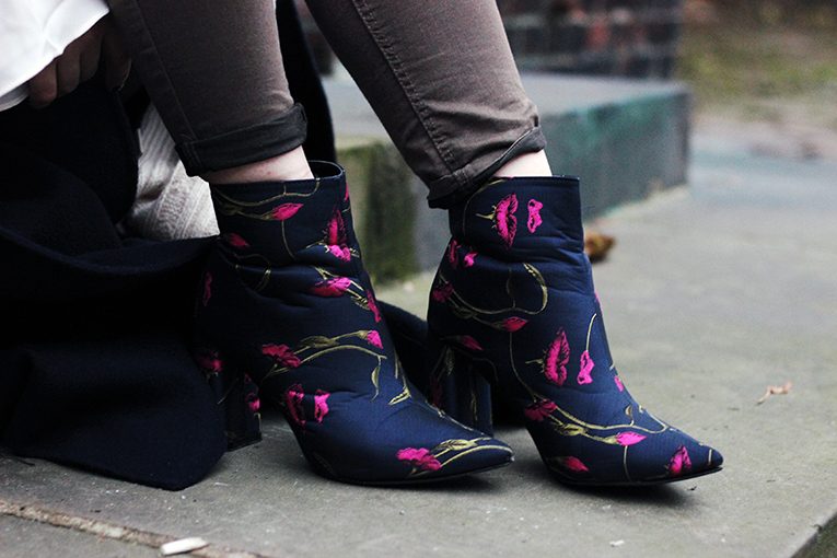 Da bei den Schuhen bereits 3 Farben vorkommen und sowohl die Absatzform, wie auch die Stickerei sehr auffällig sind, muss der Rest des Outfits eher zurückhalten sein. Sowas fällt mir immer besonders schwer: Zurückhaltung bei Eyecatcher-Pieces. In diesem Fall habe ich es so gelöst, dass ich einen Mantel in der Farbe der Stiefeletten gewählt habe und die Farbe der Blüten ebenfalls im Look noch aufgreifen.
