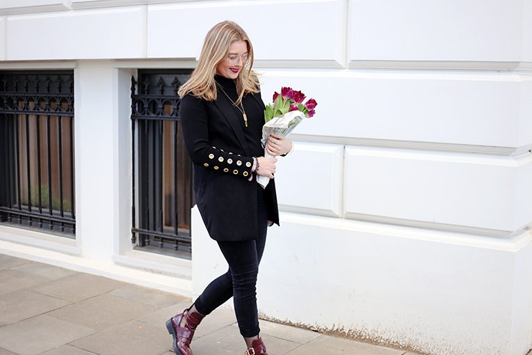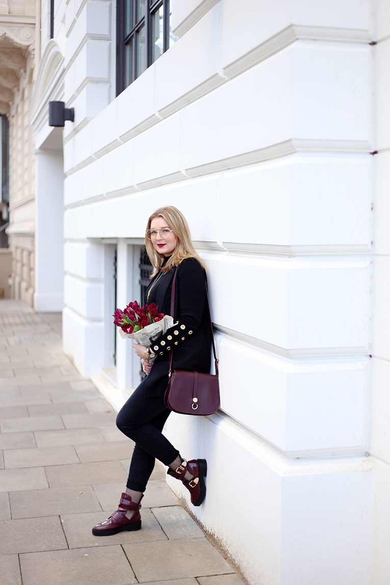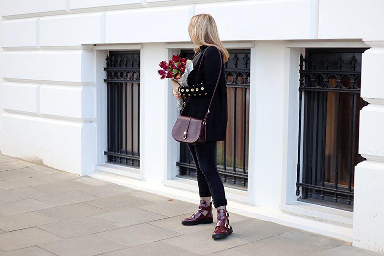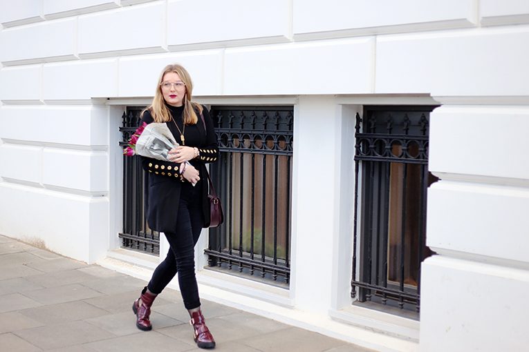 sweater: Sassy Classy (similar here)* | pants: H&M | boots: River Island (black version here)| glasses: ZARA | bracelet with heart: Bijou Brigitte* | bag: VMP Gürtel*