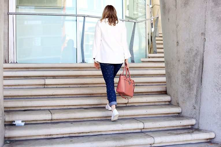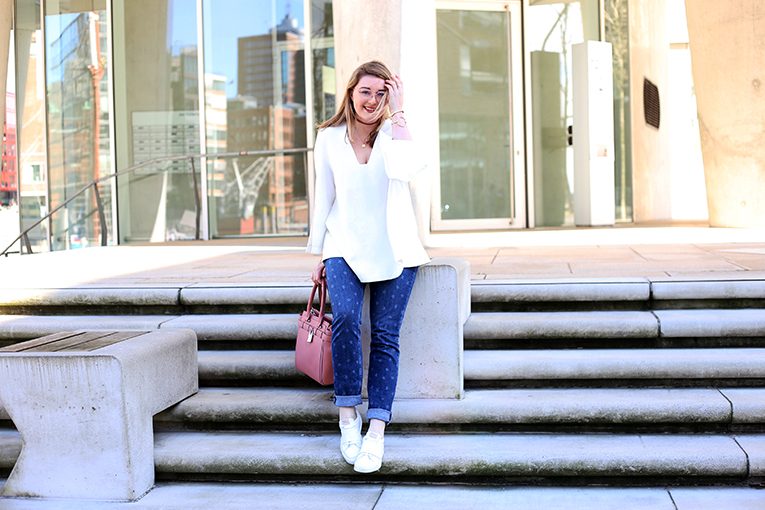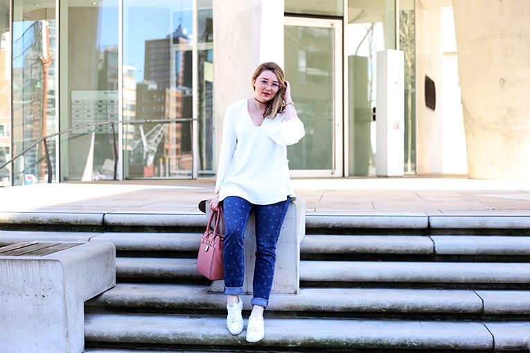 An solchen Tagen setze ich dann sicherheitshalber doch noch auf Hosen statt auf Kleider oder Röcke. Ein Look, der immer geht ist weiß und Denim. Ein schlichtes Shirt oder eine schöne Bluse zu einer Jeans kombinieren und schon hat meinen ganz easy ein simples, aber cooles Outfit zusammengestellt.