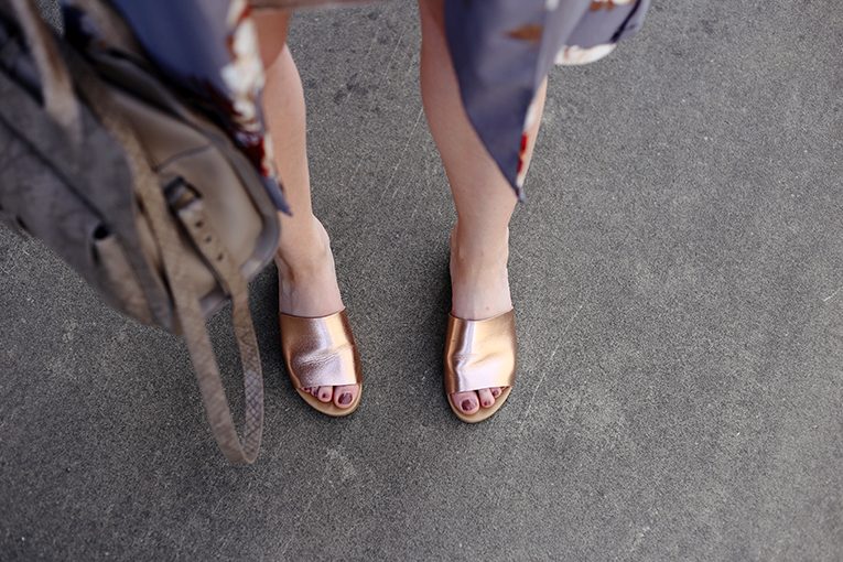 Mein aktueller Favorit sind die metallic Mules, welche ihr auf diesen Bildern seht. Einfach reinschlüpfen, nichts drückt oder scheuert und der mittelhohe, breite Absatz sorgt dafür, dass man auf dem Boden bleibt, denn was nützt das schönste Outfit, wenn der Gesichtsausdruck einfach nur gequält ist?