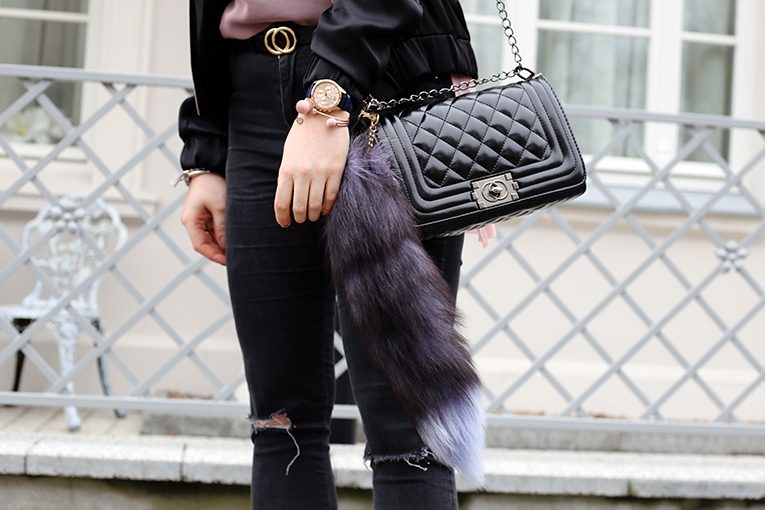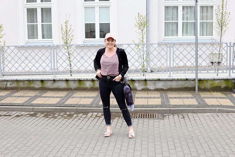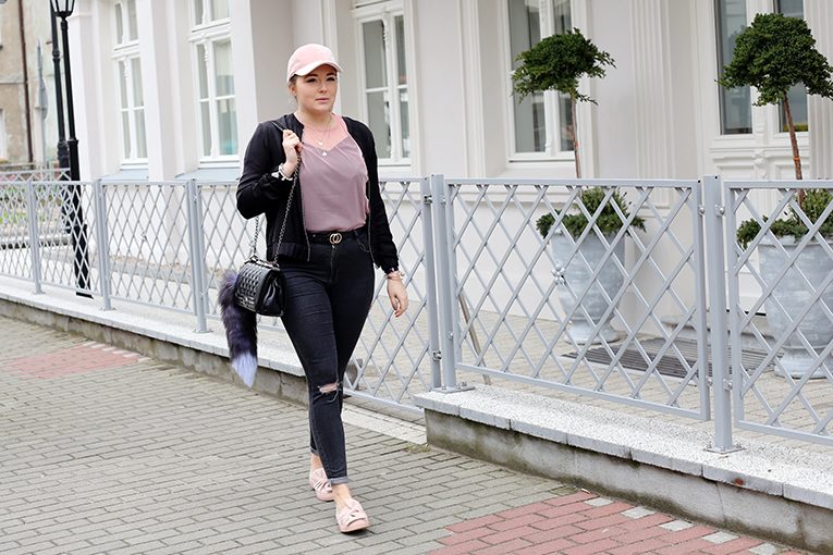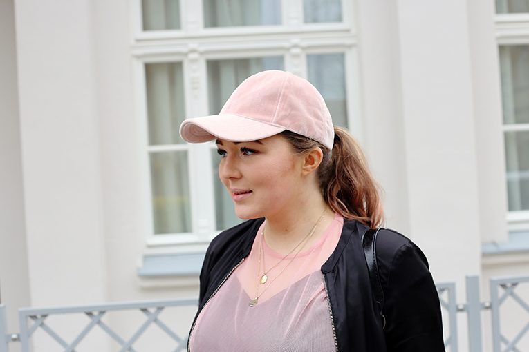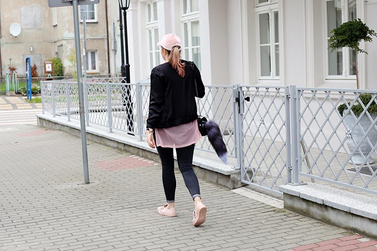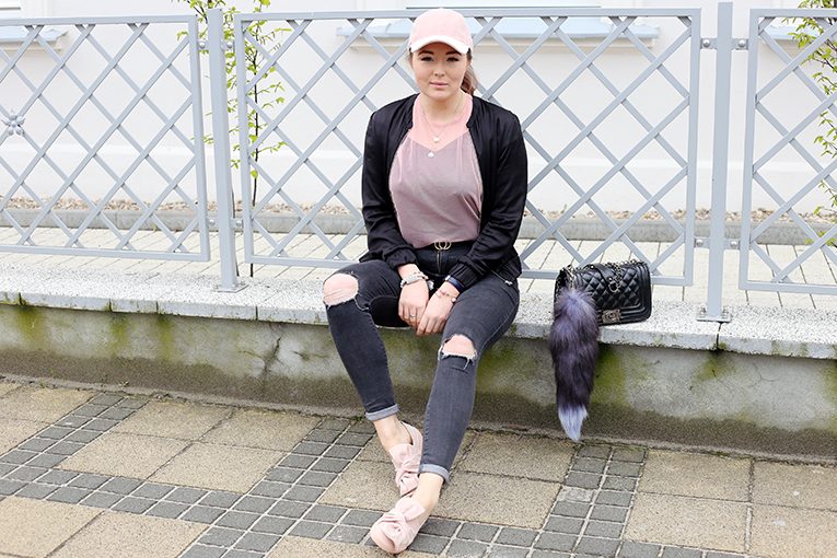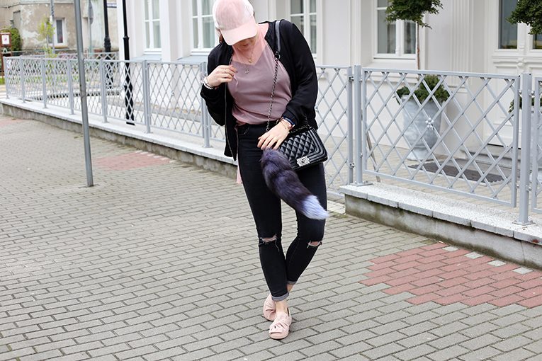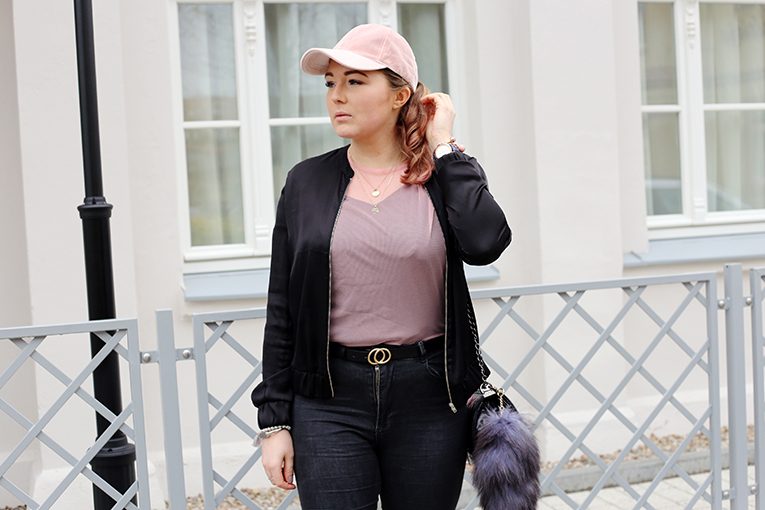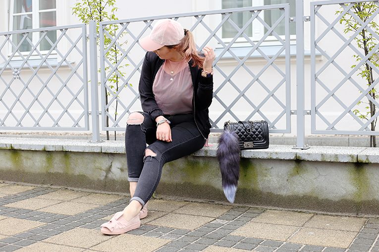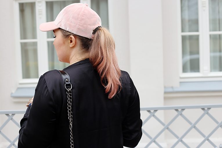 bomberjacke aus satin fuchsschwanz gina tricot hamburg modeblogger outfit pink poland reserved rosa samt cap schuhe mit Schleife slip ons with bow
