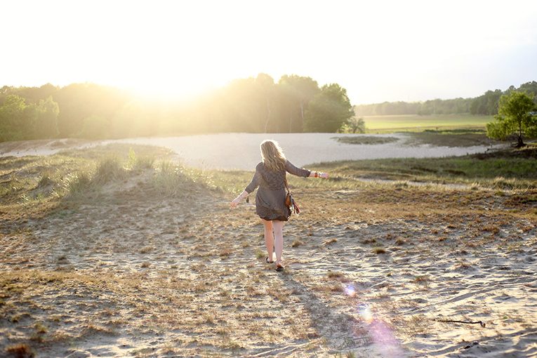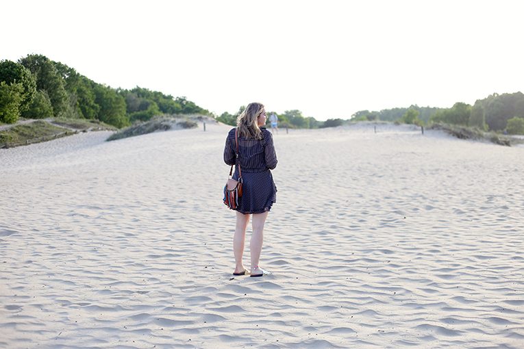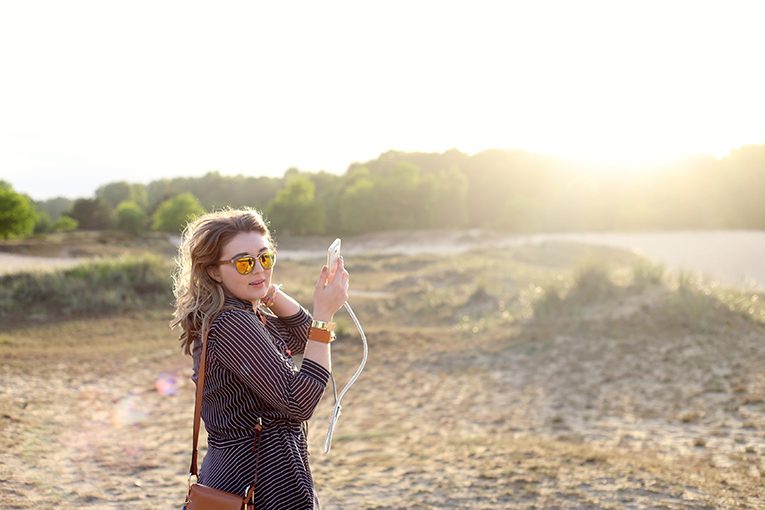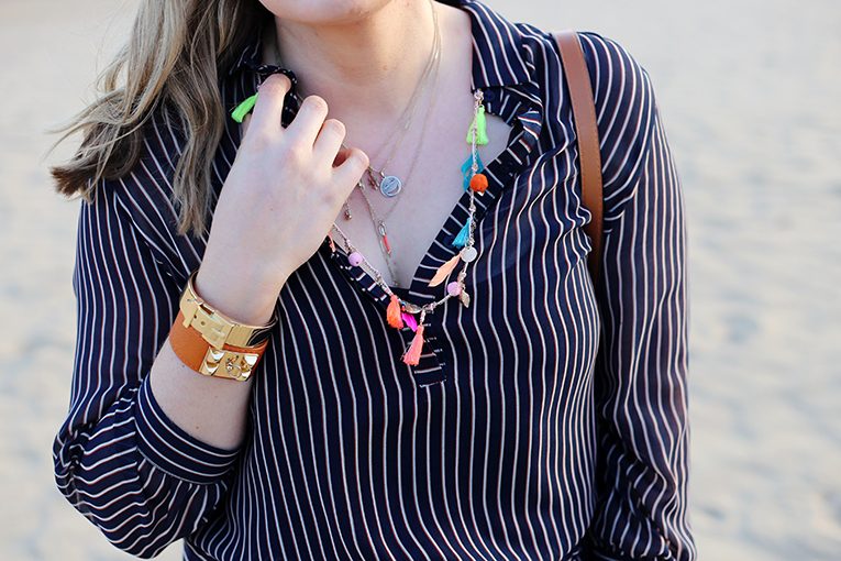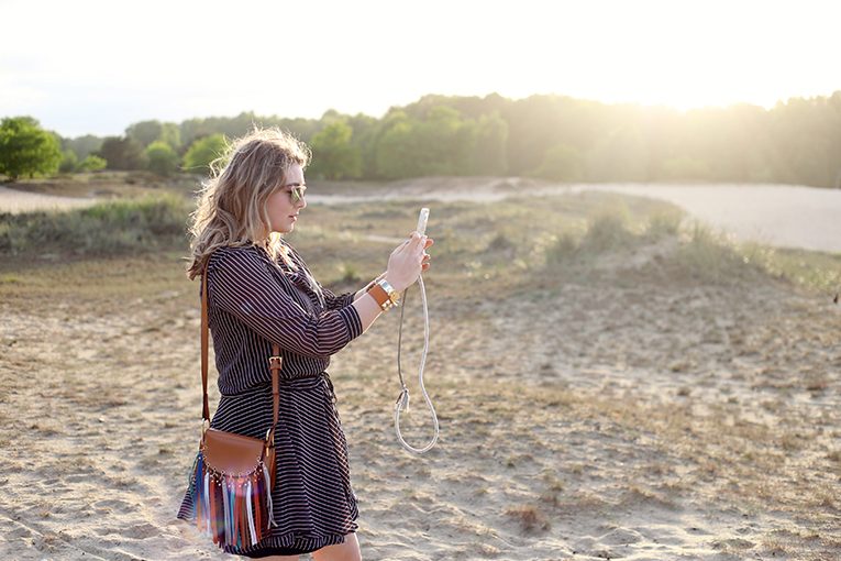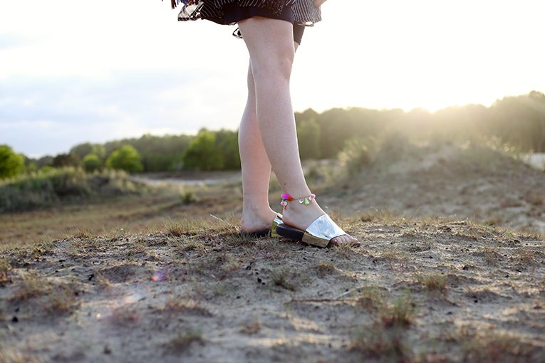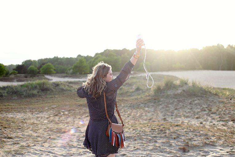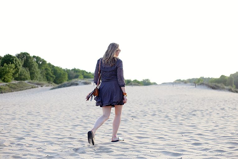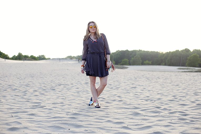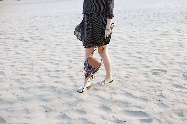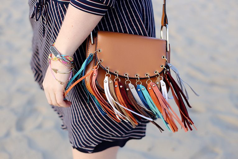 Wie macht man aus einem gestreiften Kleid einen Festival Look? Ganz einfach: Fransentasche, Tasselkette, Fußkettchen und fertig ist das festivaltaugliche Outfit.