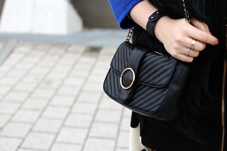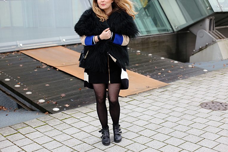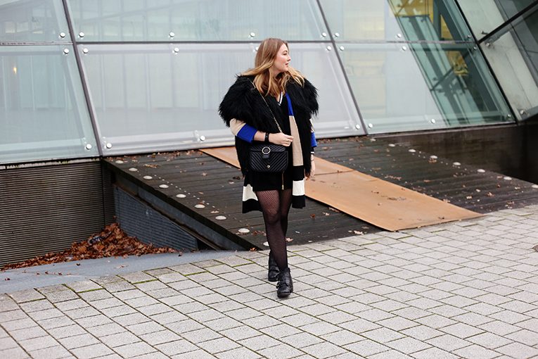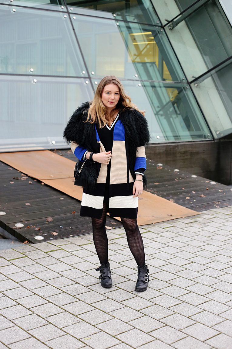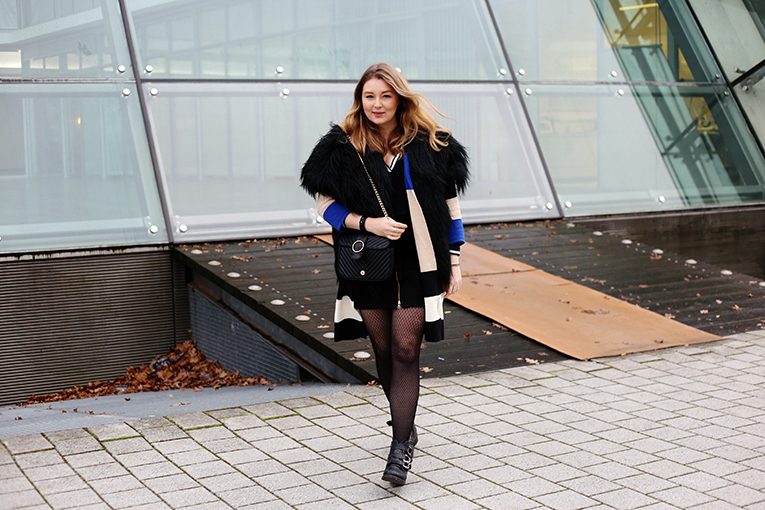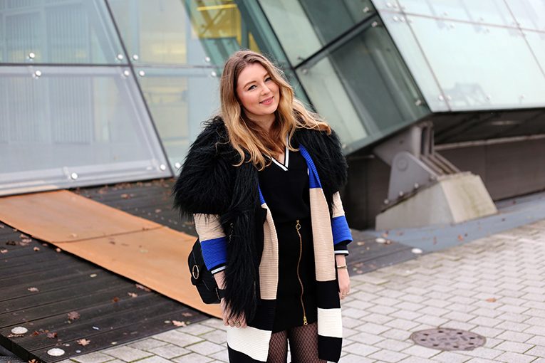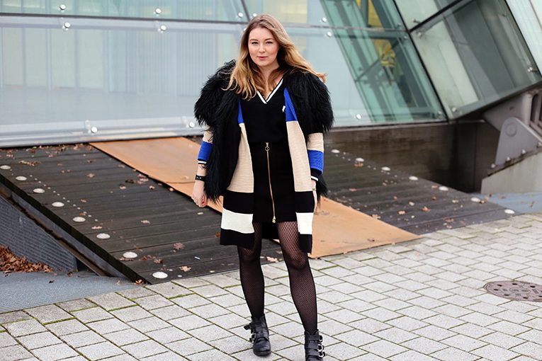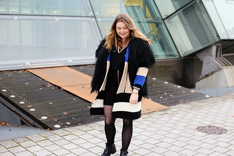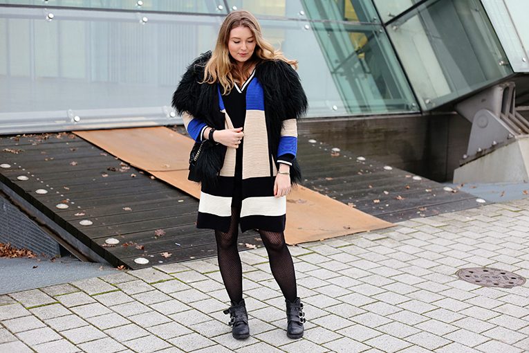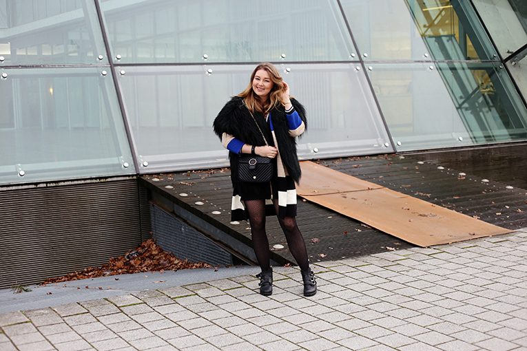 Ich greife gerne auf Layering zurück. Verschiedene Textilien und Längen machen den Look dann aus. In diesem Fall habe ich ein Tunikakleid an und darüber noch einen Rock mit goldenem Reißverschluss vorne. Dann folgt ein Cardigan mit Blockstreifen (einen ähnlichen gibt es bei Tchibo) und noch eine Fake Fur Weste, die ein wenig kürzer ist als der Cardigan. Fertig ist der Layering Look, bei dem man auch mal eine Schicht ablegen kann und dennoch alles stimmig bleibt. Dies ist der Grund, weshalb ich bei solchen Outfits versuche in möglichst einer Farbwelt zu bleiben. Anderenfalls würde der Look überladen aussehen. Durch die unterschiedlichen Materialien wie Strick und Fake Fur erhält der Look bereits genug Spannung.