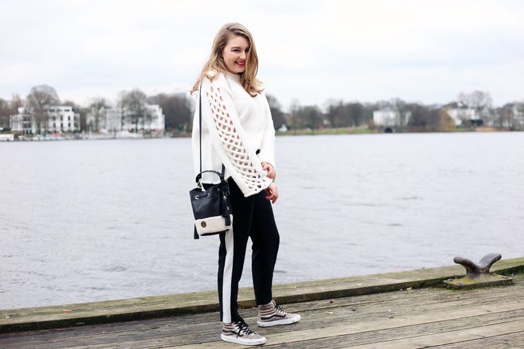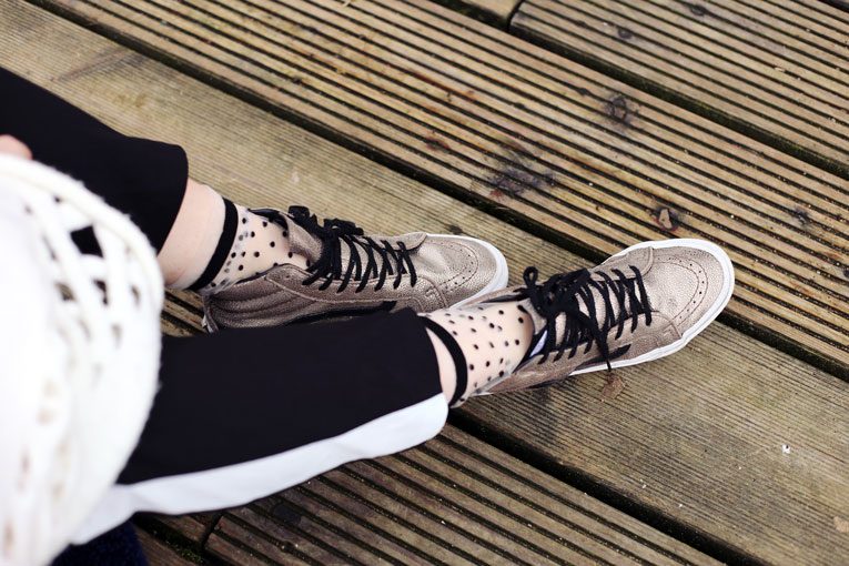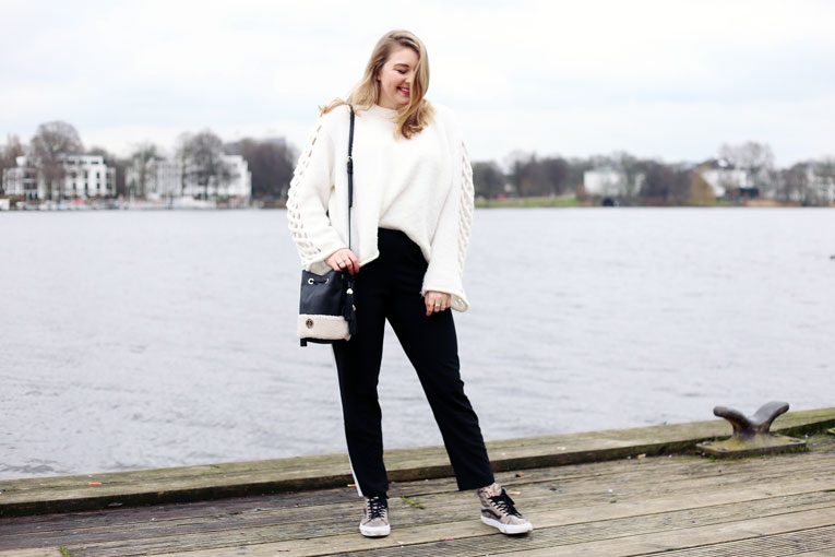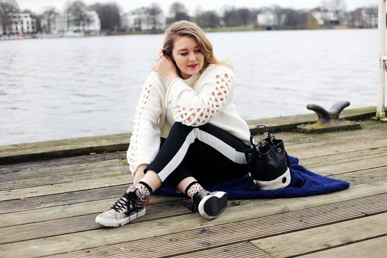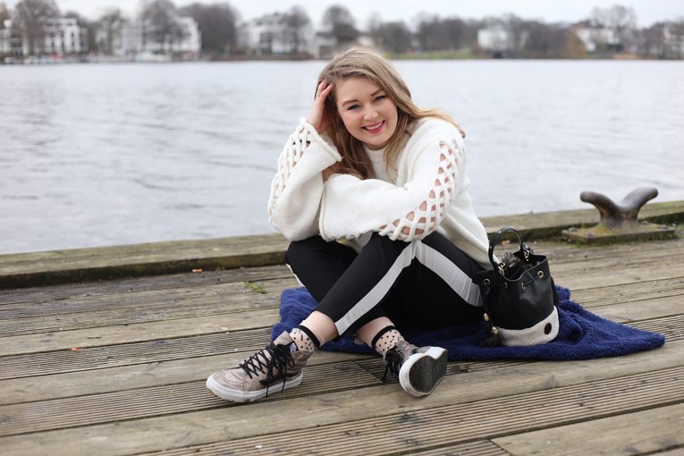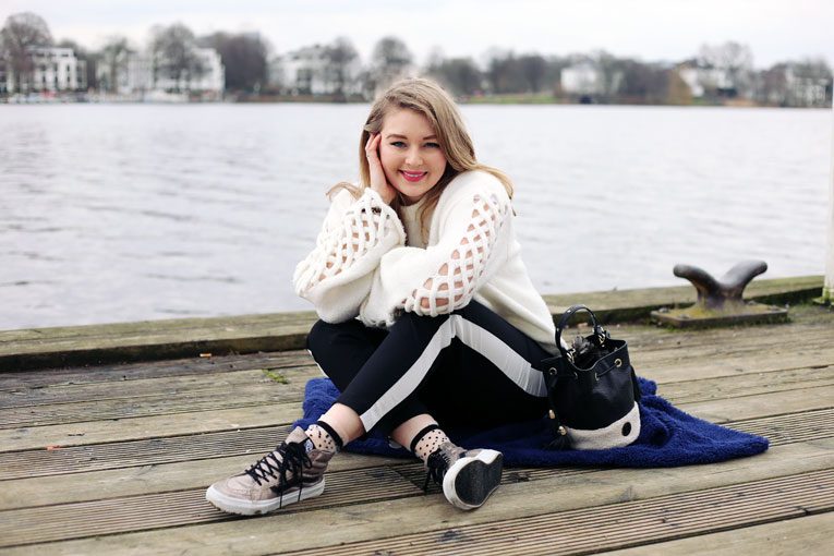 An kalten Tagen trage ich am liebsten flauschige Oversizepullover und gemütliche Jogpants. Ein richtiges Wohlfühl-Outfit eben! Um das ganze nicht ganz so casual wirken zu lassen, achte ich auf die Details. Schuhe in Metallicoptik, gepunktete Söckchen oder auch Schmuck ergänzen da Outfit und machen es alltagstauglich. Schließlich soll es nicht so aussehen, als wäre ich im Sonntags-Schlabberlook unterwegs.